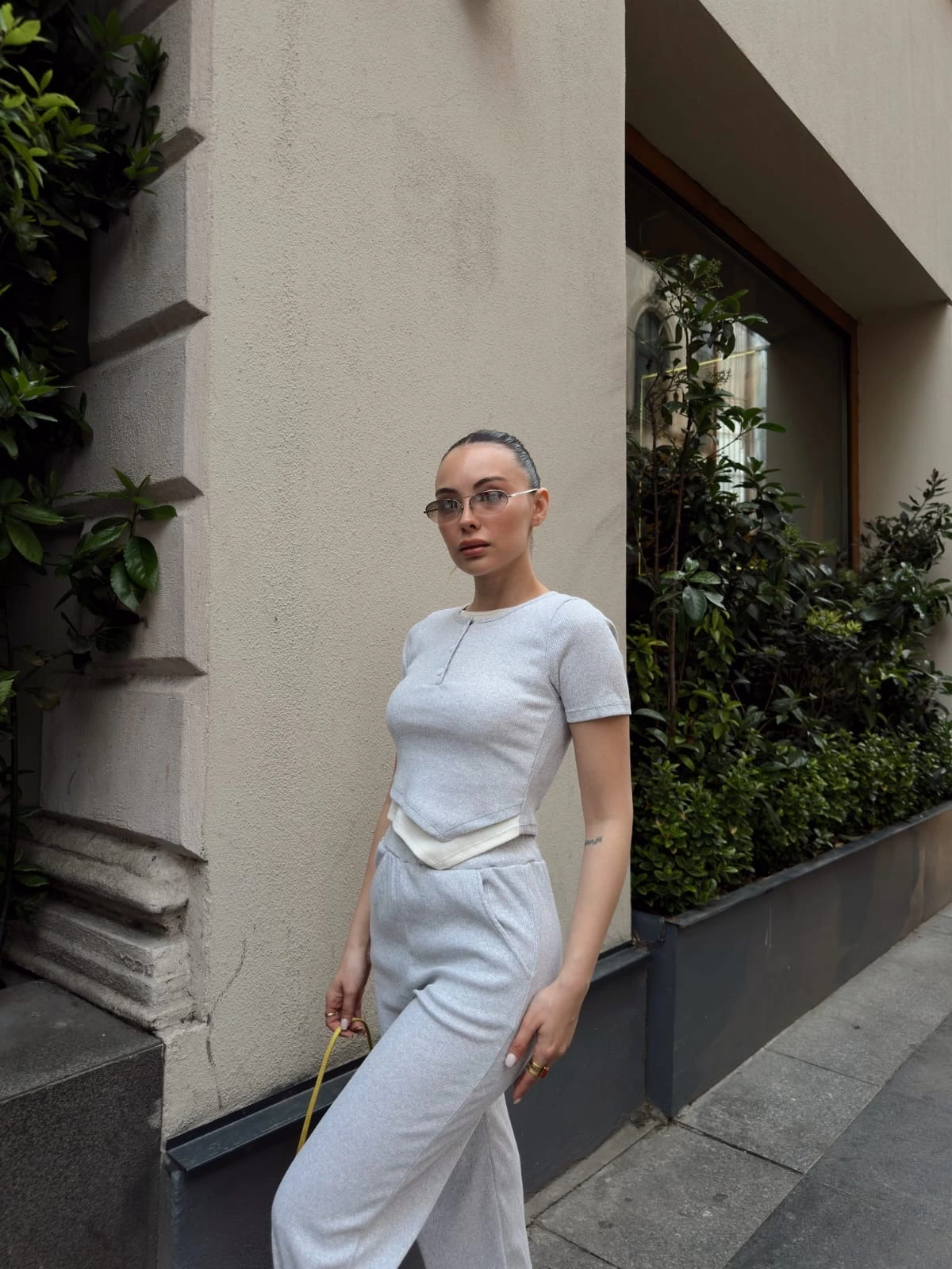 Şıklığı ve rahatlığı bir arada sunan Düğme Yakalı Gri Alt Üst Takım S3943, kadın giyim kategorisindeki favori tercihlerden biridir.