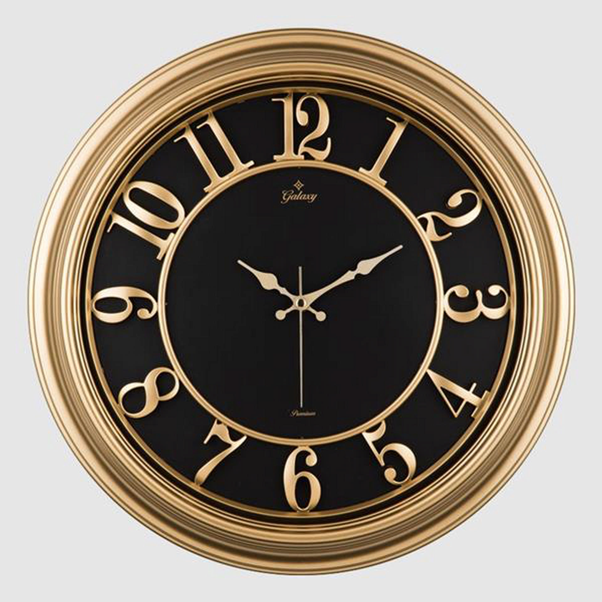 DUVAR SAATİ ALTIN SARISI ÇERÇEVELİ İÇİ SİYAH 46CM KABARTMA RAKAMLI SELEFON KORUMALI AMERİKAN BRİSTOL KADRAN METAL AKREP/YELKOVAN/SANİYE AKAR SANİYELİ MEKANİZMA AKRİLİK BOYA ABS HAMMADDE MİNERAL CAM