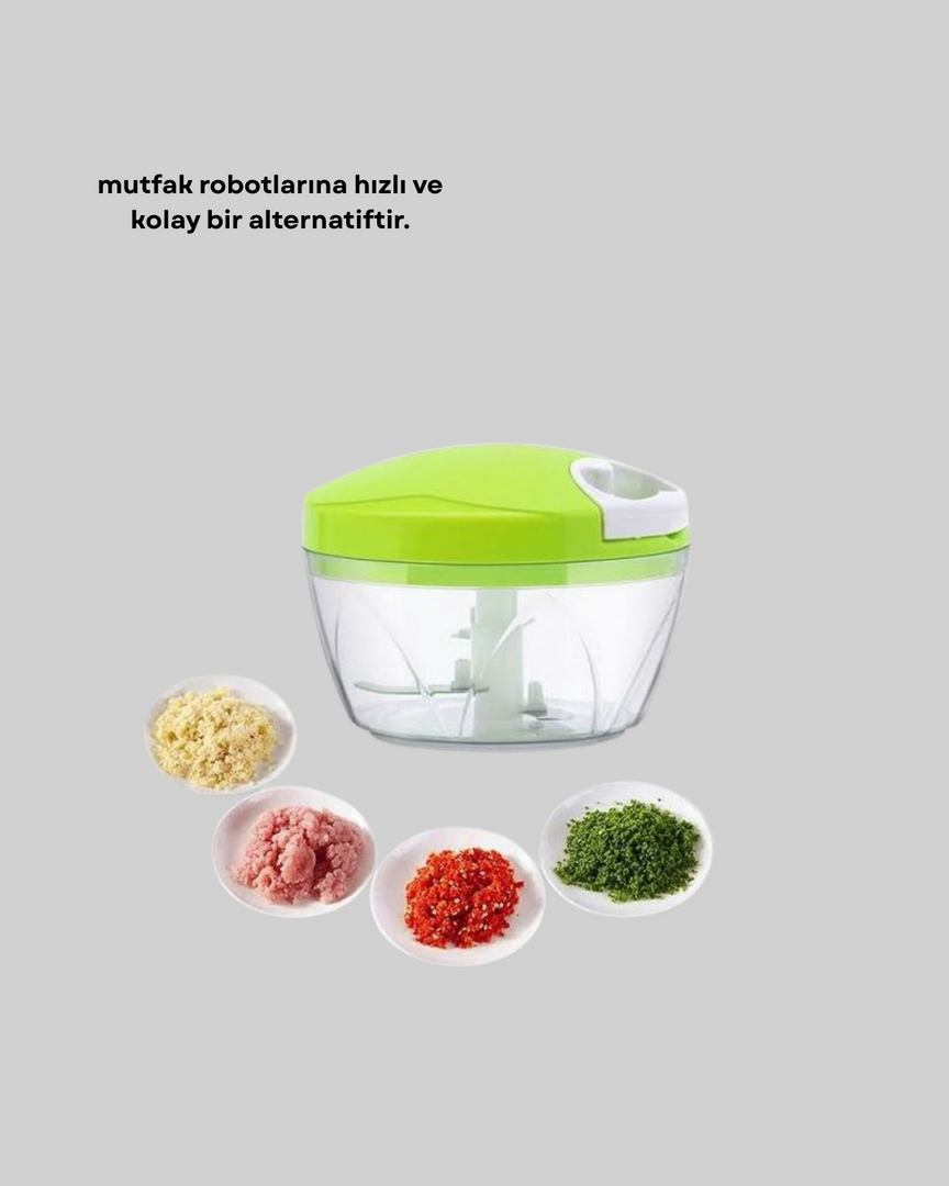 Manuel yiyecek doğrayıcı, mutfakta hız ve pratiklik arayanlar için tasarlanmış kullanışlı bir yardımcıdır. Elektrik gerektirmeyen ipli mekanizması sayesinde her ortamda rahatlıkla kullanılabilir. Üç adet paslanmaz çelik bıçağı, yiyecekleri kısa sürede eşit parçalara ayırarak yemek hazırlık süresini kısaltır. Küçük porsiyonlar için idealdir ve mutfak robotlarına kıyasla çok daha az yer kaplar. Kolay temizlenebilir yapısı, hijyenik ve güvenli kullanım sunar. Günlük yemek hazırlıklarında zaman kazandıran, pratik ve dayanıklı bir mutfak ürünüdür.