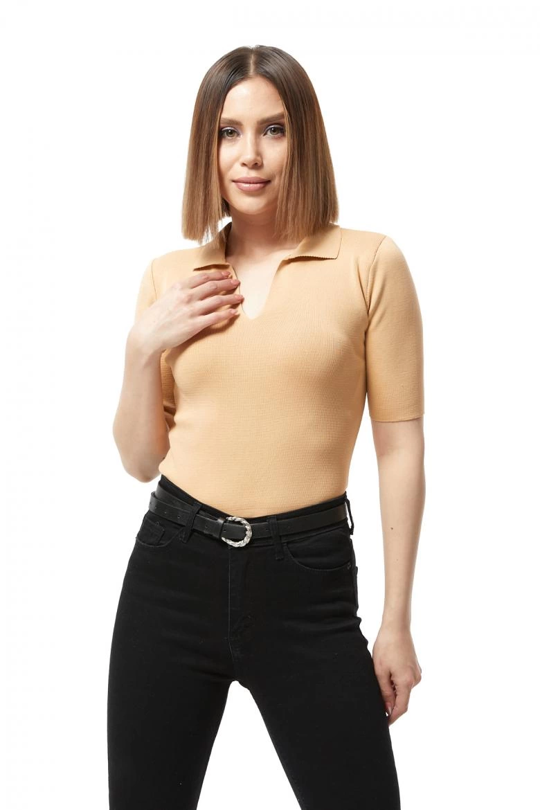 Gömlek yaka yazlık triko bluz Bej (Beden: STANDART)
