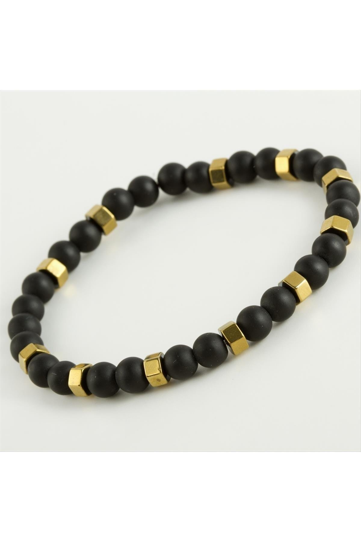 Doğaltaş Bileklik; Ürün malzemesi hematit ve mat onix doğaltaştan imal edilmiştir. Ürün malzemesi misina üzerine dizilmiştir. Ürün taş boyları 6 mmdir.