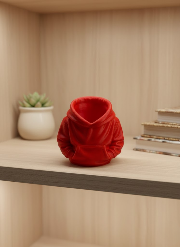 Kırmızı hoodie kalemlik, masa üstü düzenini sağlarken dekoratif bir görünüm sunan eğlenceli bir aksesuardır. 10×10 cm ölçüsü ile masa, raf veya kitaplık üzerinde rahatlıkla kullanılabilir. Hoodie şeklindeki tasarımı, ürünü sıradan kalemliklerden ayırarak özgün bir stil ortaya koyar.