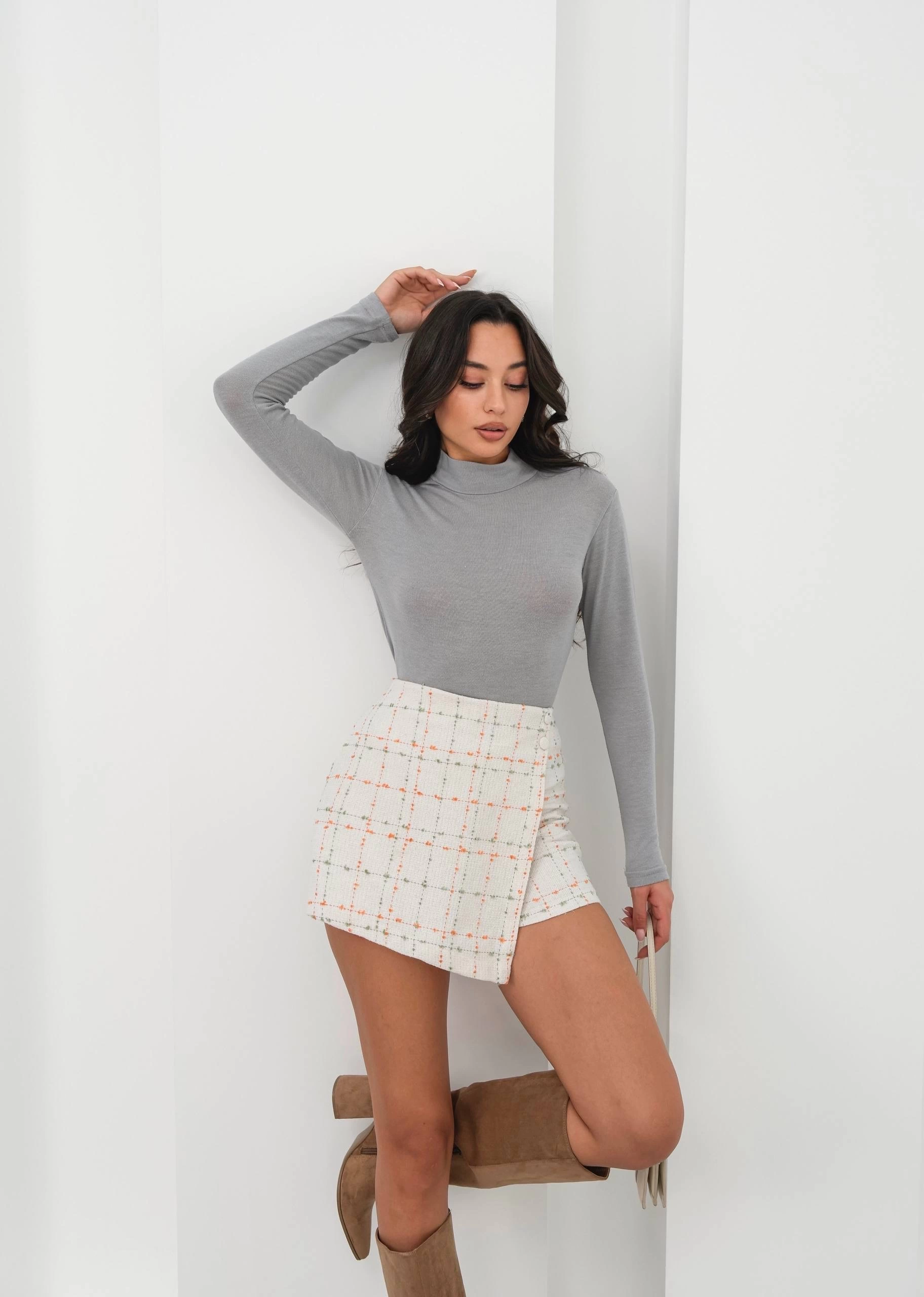 Kaz ayağı desenli Ch kumaştan üretilen şort etek, şıklığı ve rahatlığı bir arada sunar.