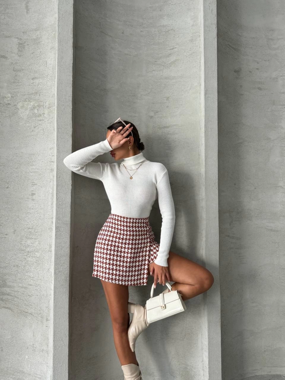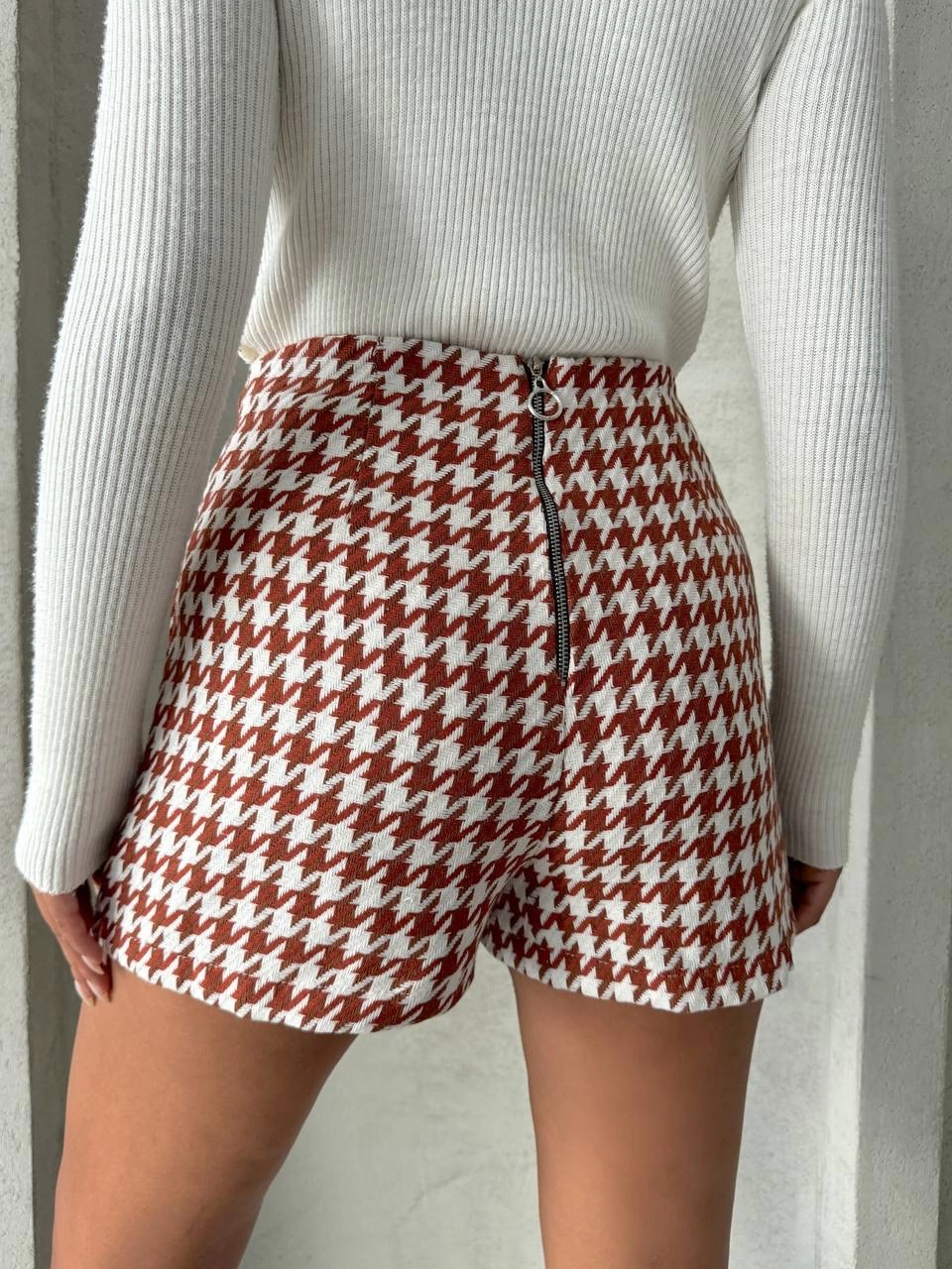 İki Düğmeli Kaz Ayağı Desen Ch Kumaş Şort Etek Bordobeyaz H26414 (Beden: Xl)