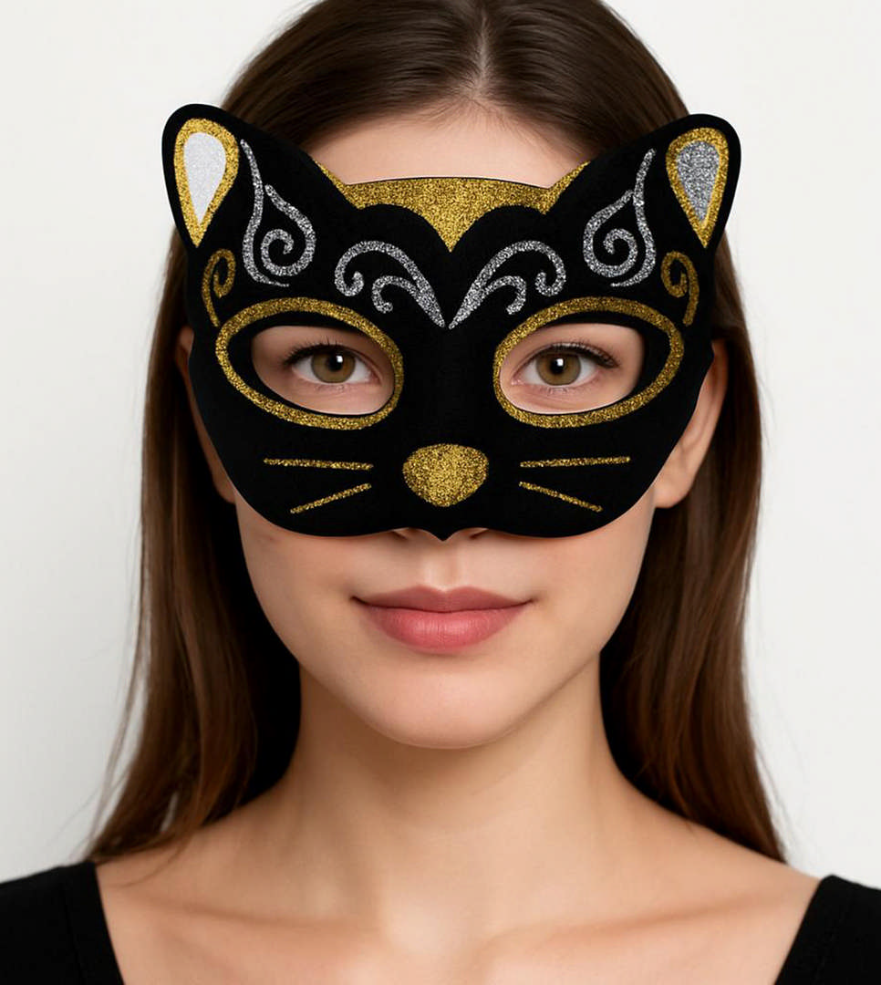 Karnaval, parti ya da özel konseptli davetler için tasarlanmış bu süet dokulu, ışıltılı kedi maskesi, şıklığın ve gizemin buluşma noktası. Siyah zemin üzerine altın ve gümüş sim işlemeleriyle bezenmiş olan bu maske, hem konfor hem de göz alıcılık sunar.