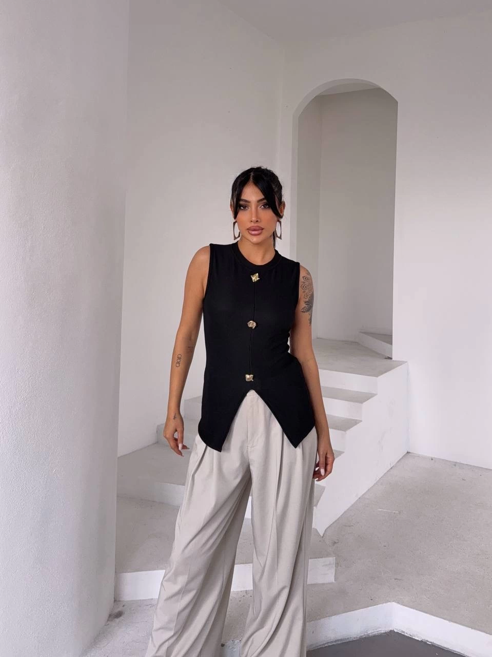 Bisiklet yaka tasarımıyla modern bir hava katan bluz, gold düğmeleriyle de göz alıcı bir detay sunuyor.