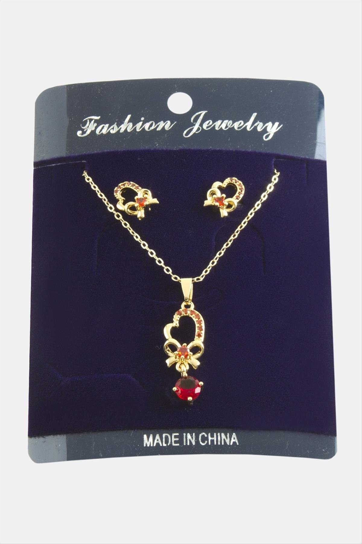 Kalp Fiyong Zirkon Taşlı Set Kolye-Kırmızı