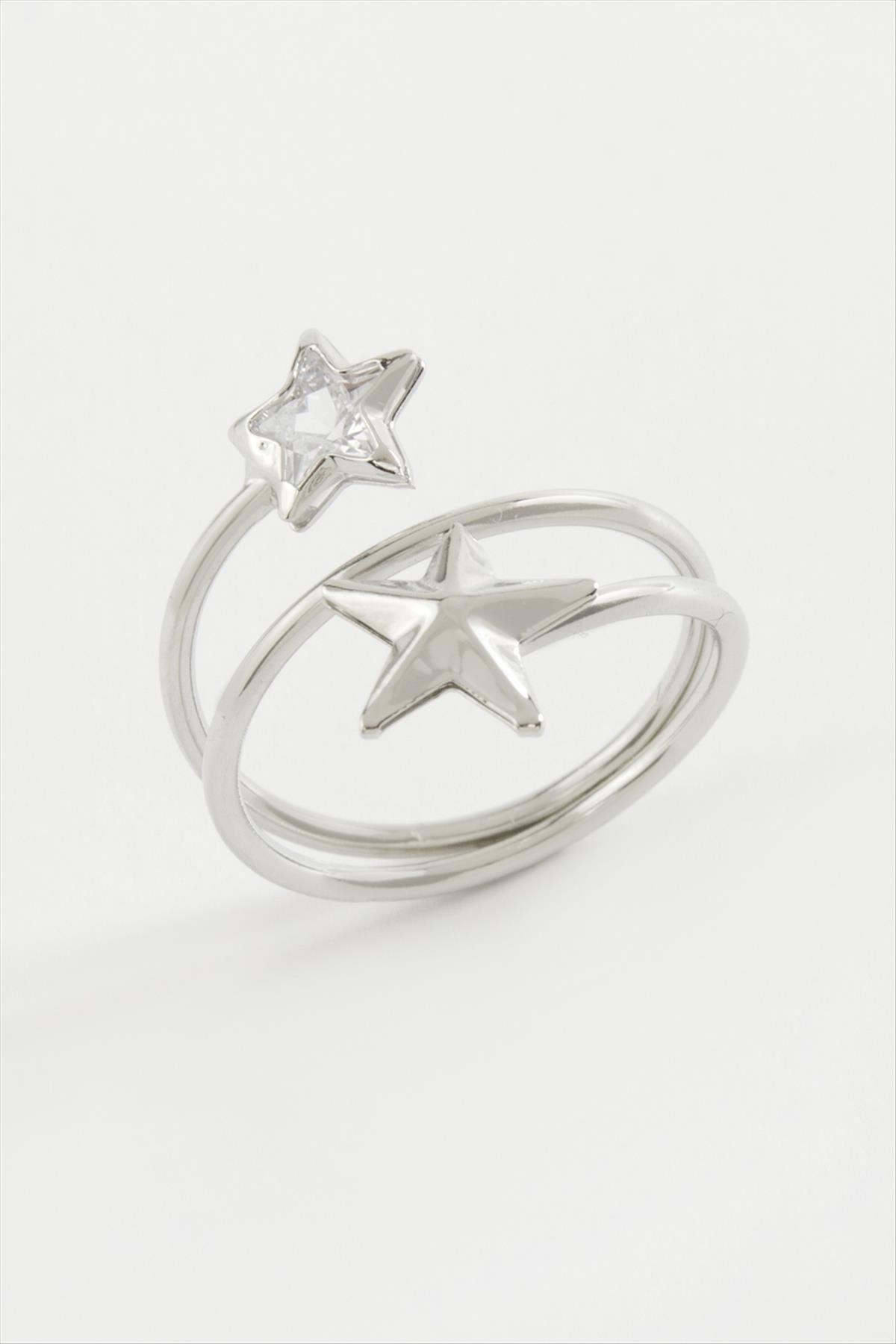 Kalp Yıldız Zirkon Taşlı Yüzük-Gümüş Rengi