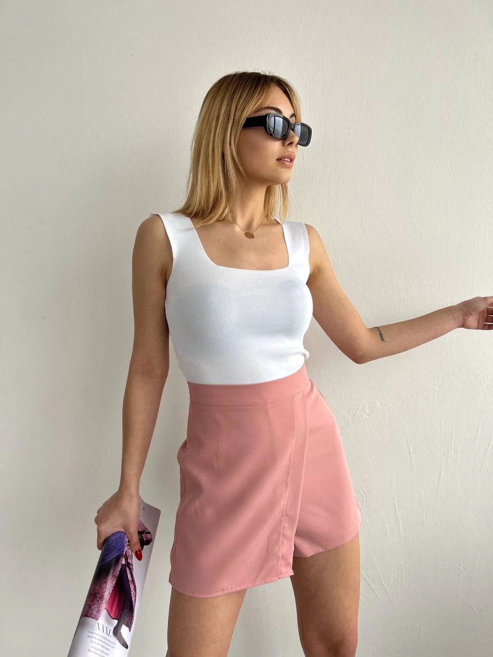 Kapaklı şort etek pudra S208, şıklık ve rahatlığı bir arada sunar.