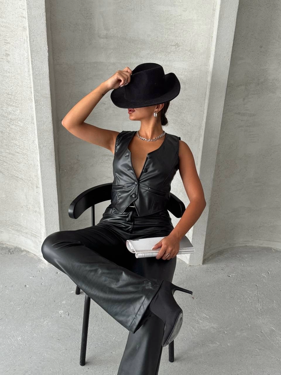Kaplama düğmeli deri yelek siyah s24398 (Beden: M)