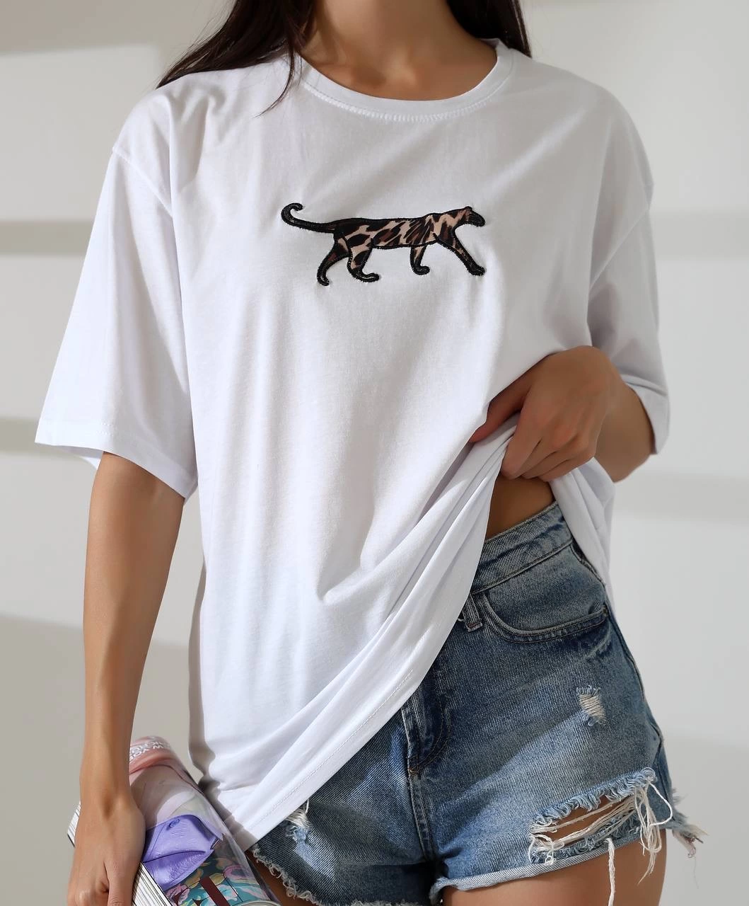Kaplan nakış işlemeli Oversize tişört Beyaz (Beden: L)