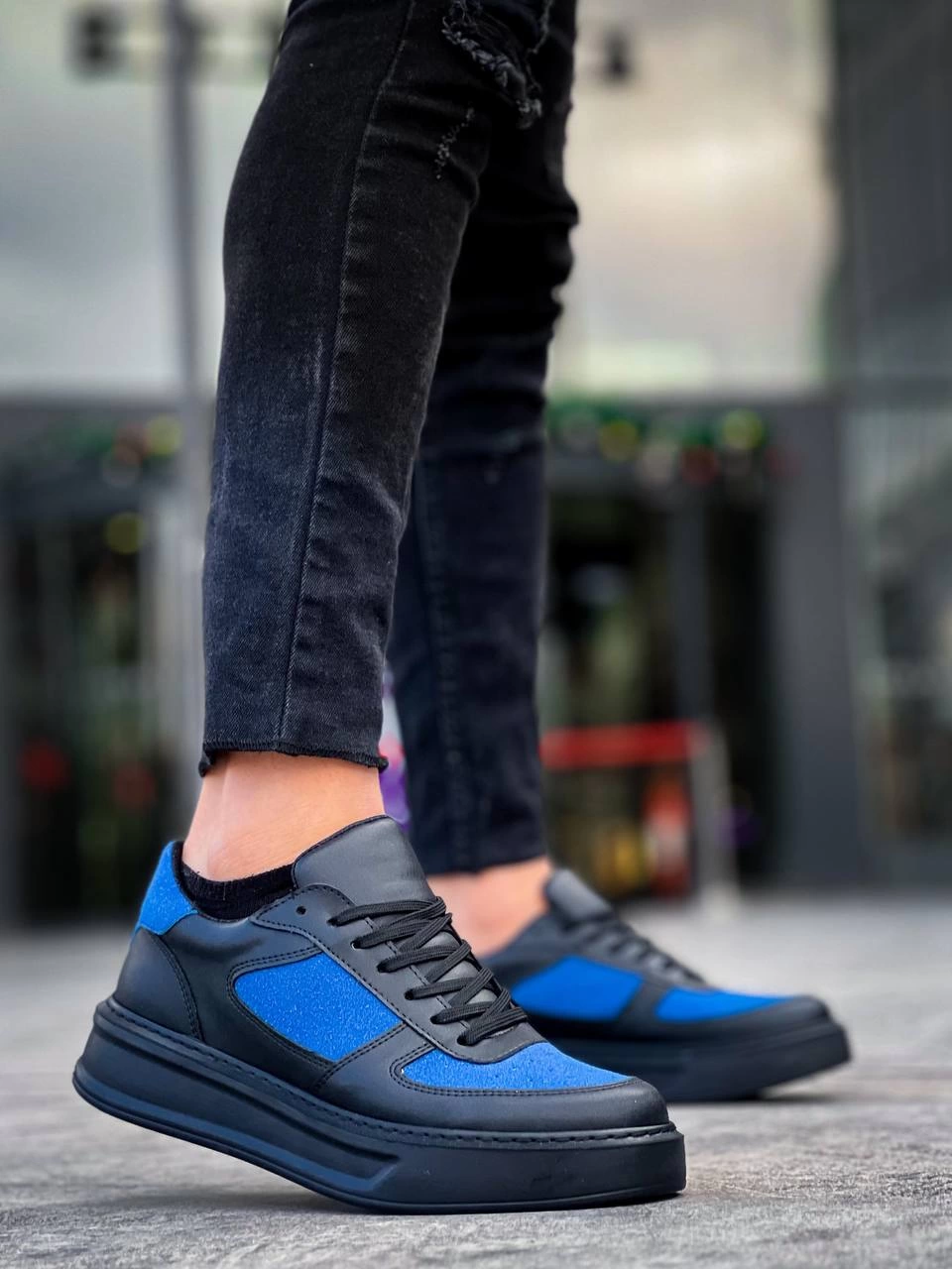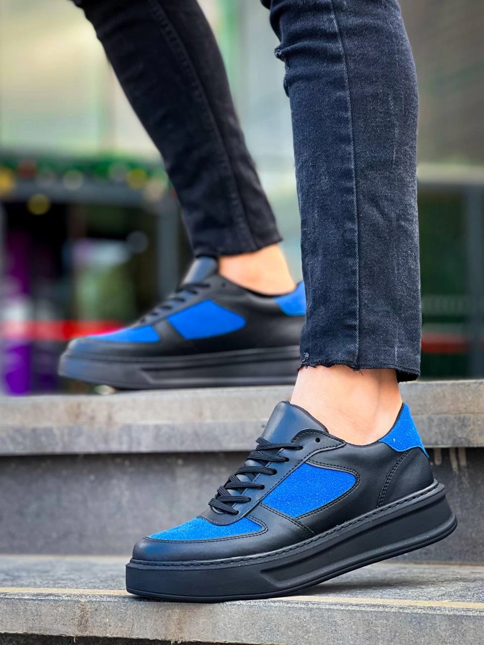 Kb-X8 Kuback Siyah Cilt Mavi Süet Detaylı Siyah Yüksek Taban Günlük Spor Ayakkabı (Numara: 43)