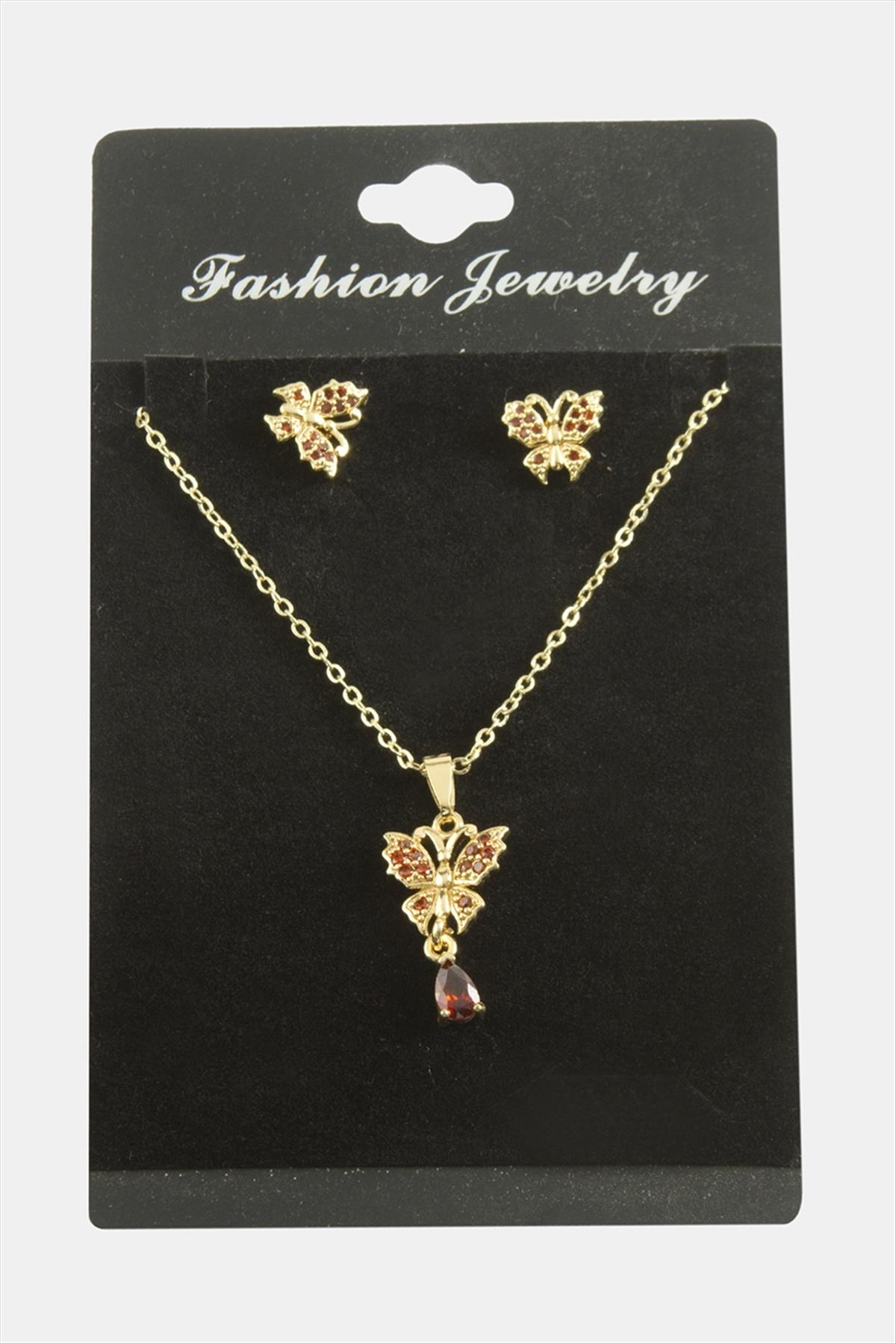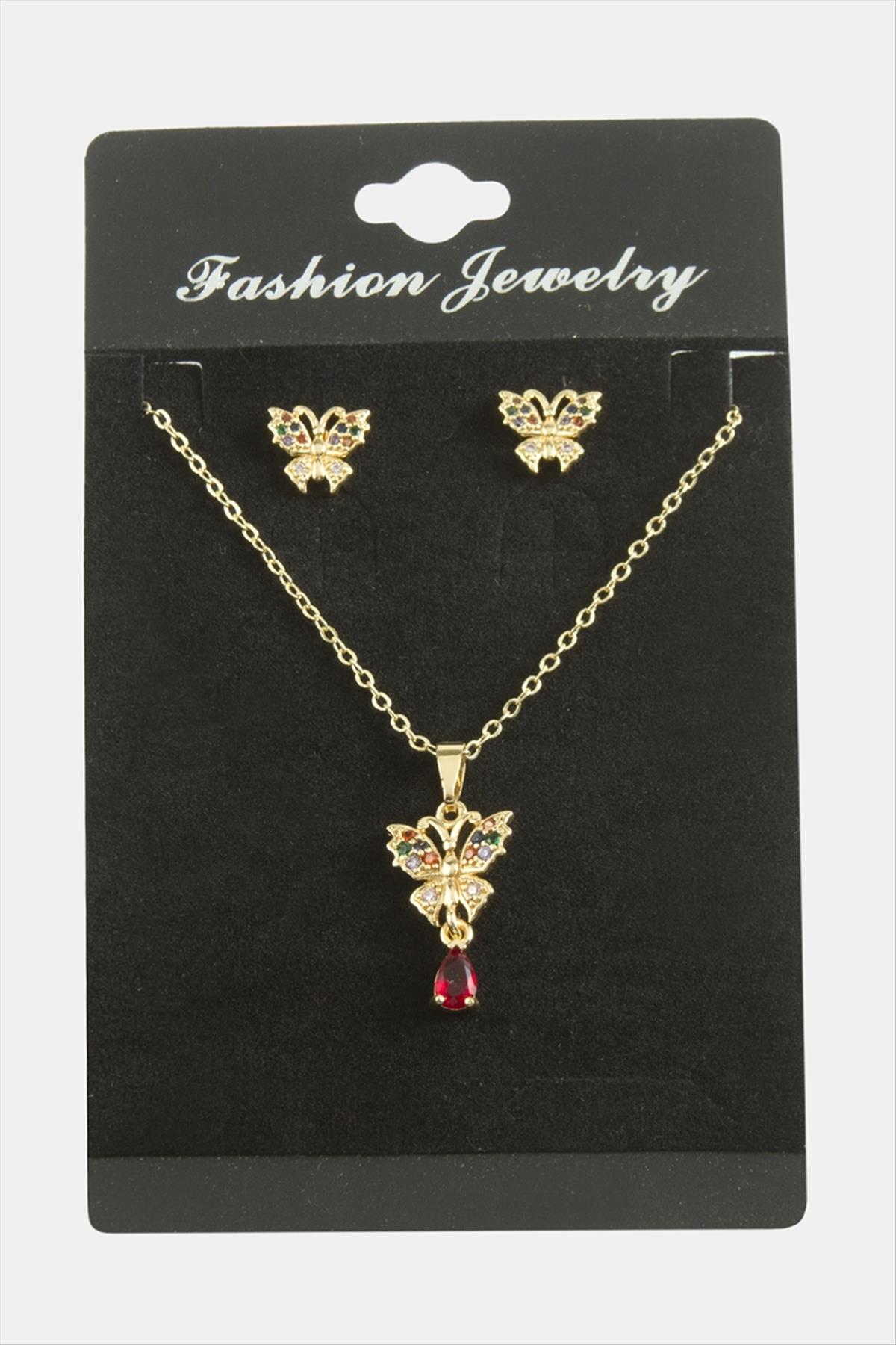 Kelebek Zirkon Taşlı Set Kolye-Kırmızı