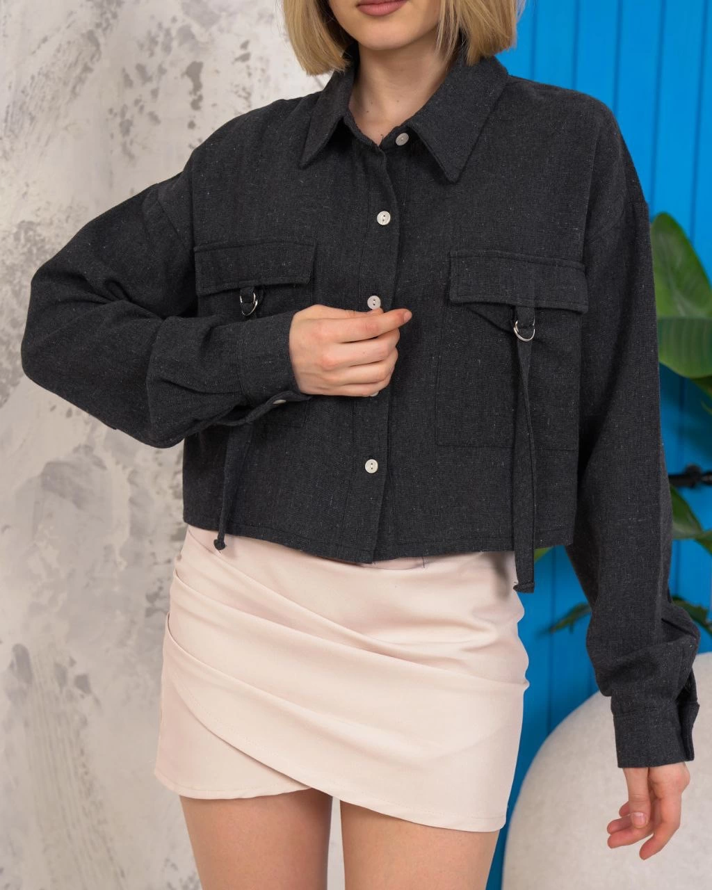 Yaz aylarının vazgeçilmezi olan kemer cepli keten crop gömlek siyah, şıklığı ve rahatlığı bir arada sunuyor.