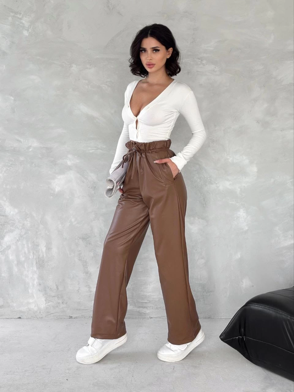 Şıklığı ve rahatlığı bir arada sunan Kendinden İnce Kemerli Deri Pantolon Kahve T1178, gardırobunuzun vazgeçilmezi olmaya aday! İnce bel kısmı sayesinde vücudu saran ve belinizi ön plana çıkaran bu pantolon, deri dokusuyla da şıklığına şıklık katıyor.