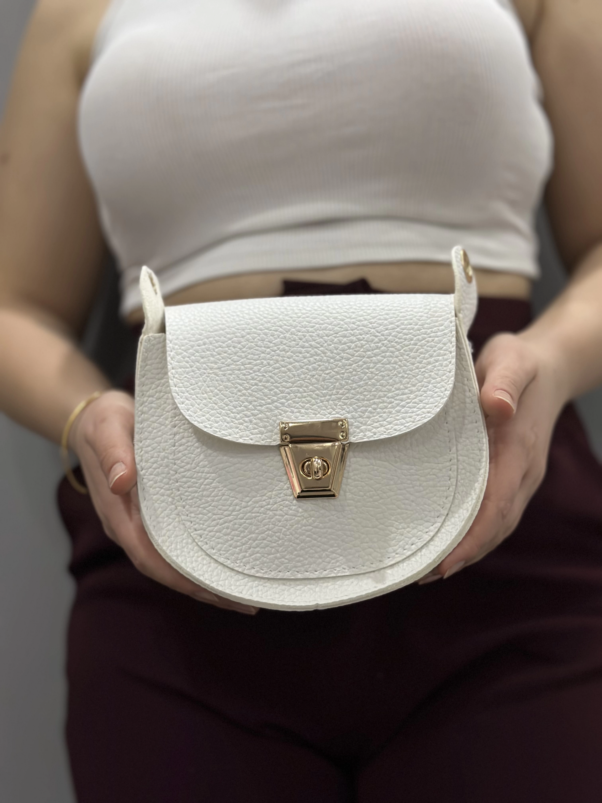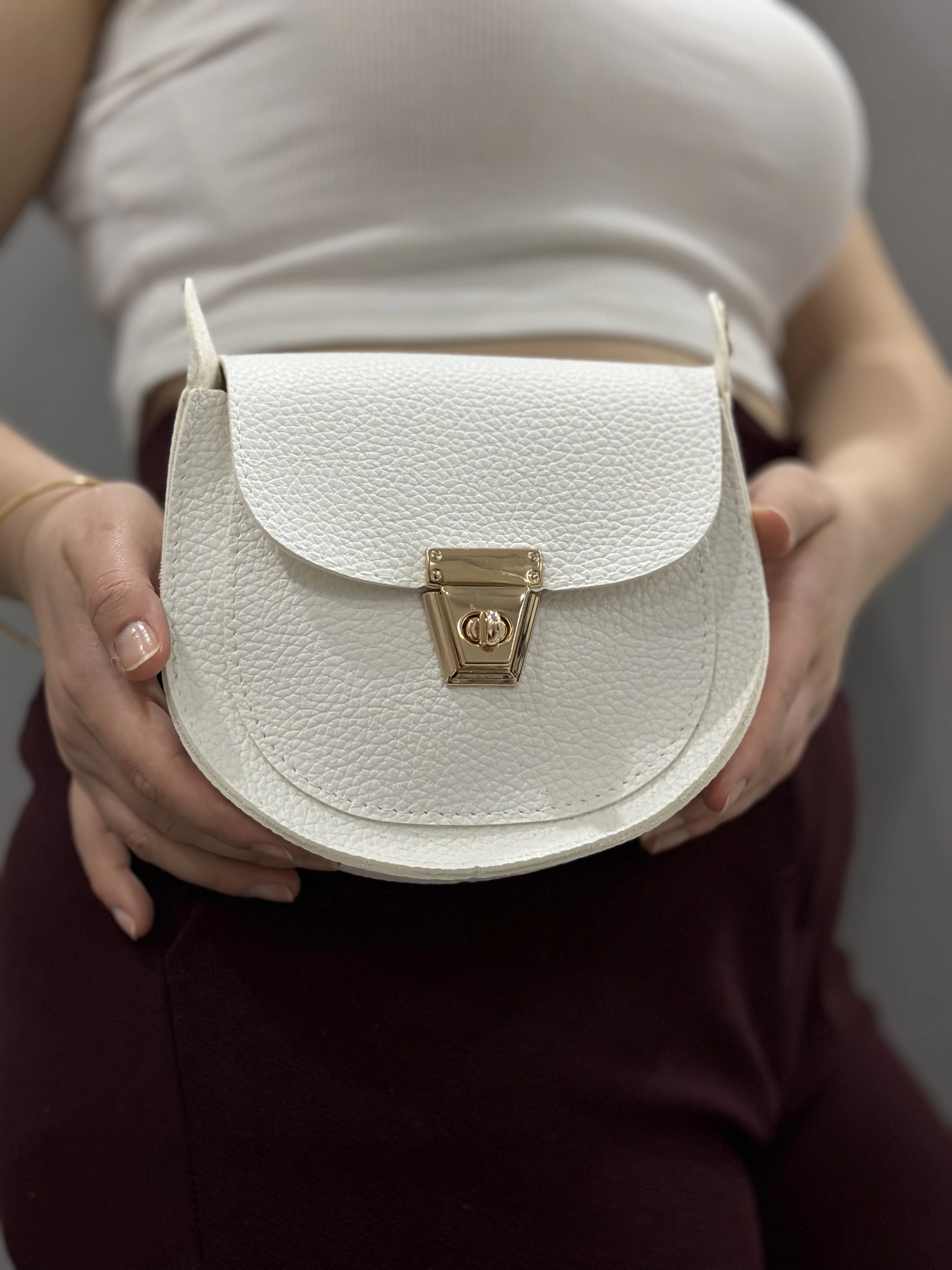 Lüks ve şık tasarımıyla dikkat çeken klasik kapaklı beyaz cilt çanta, günlük kullanımınızda size şıklık ve pratiklik sunuyor.