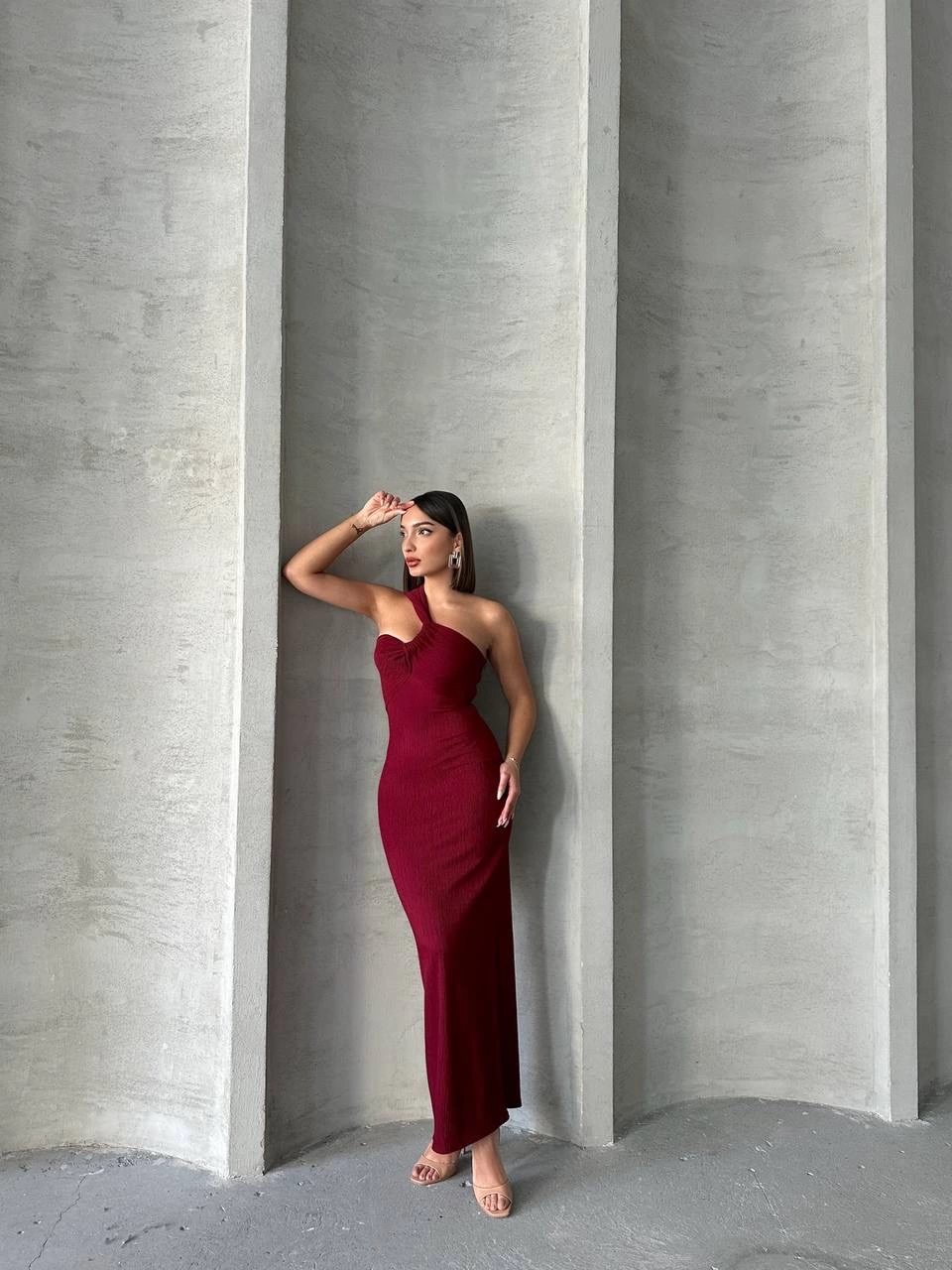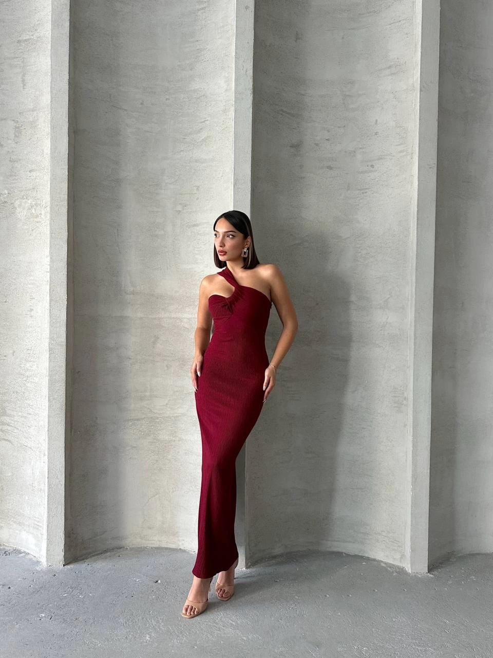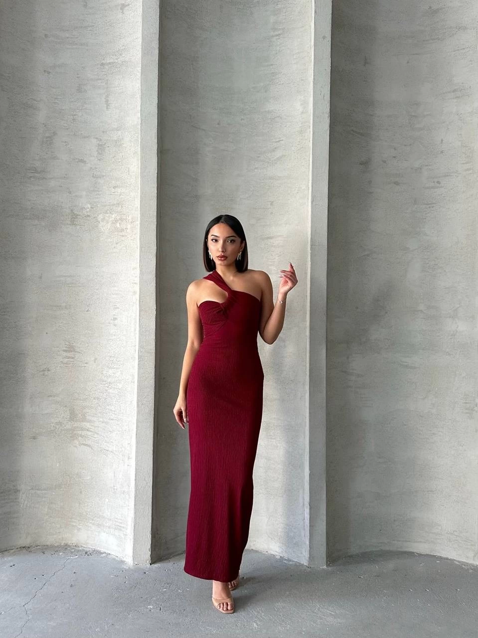 Krinkıl tek omuz uzun elbise bordo S25455, şıklık ve rahatlığı bir arada sunar.