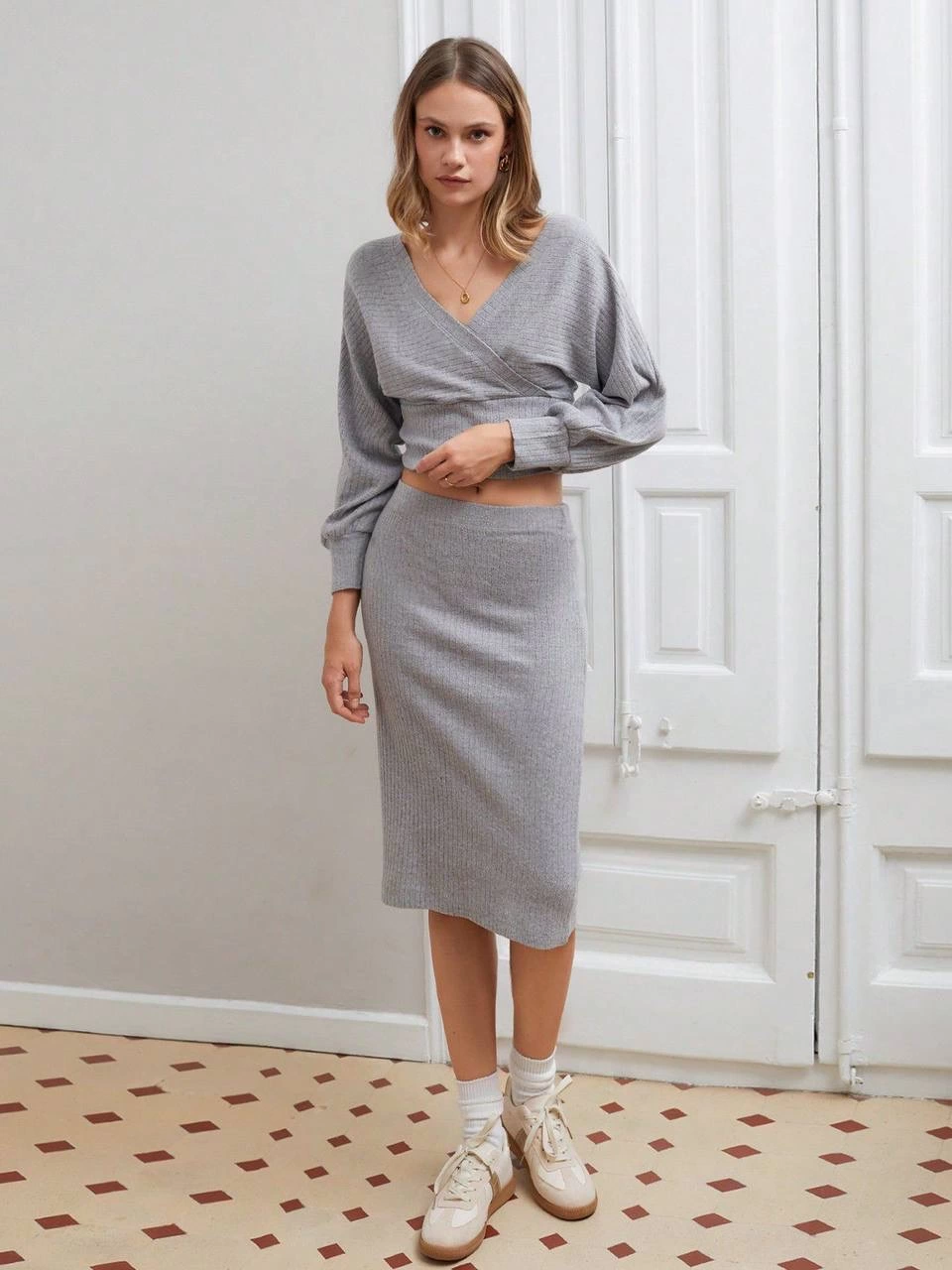 Şıklığı ve rahatlığı bir arada sunan Kruvaze Şardonlu Etekli Takım Gri, gardırobunuzun vazgeçilmezi olmaya aday!