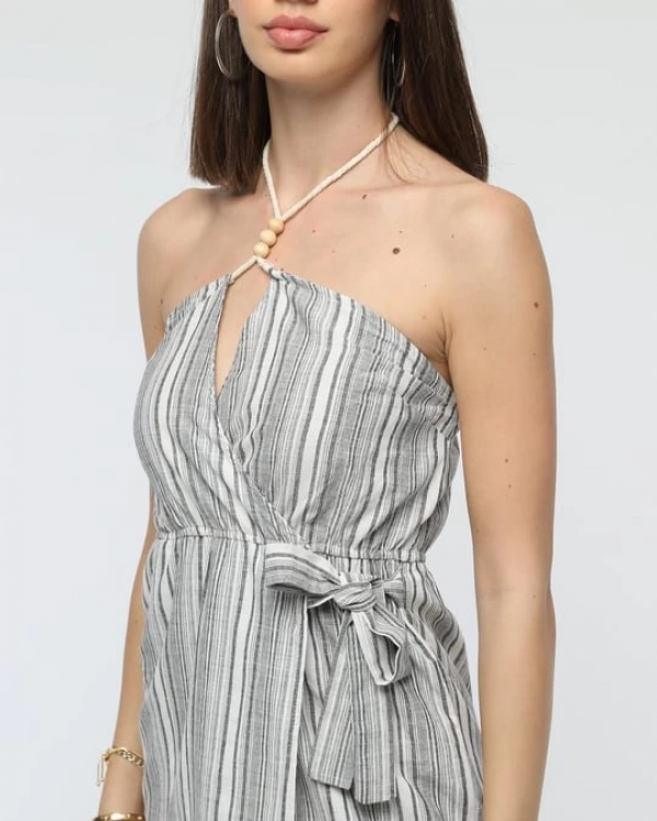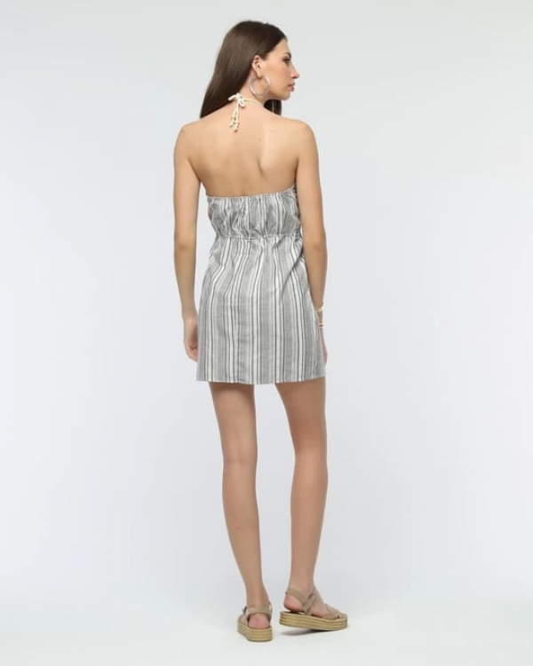 Kuşaklı çizgili mini keten elbise Gri (Beden: M)