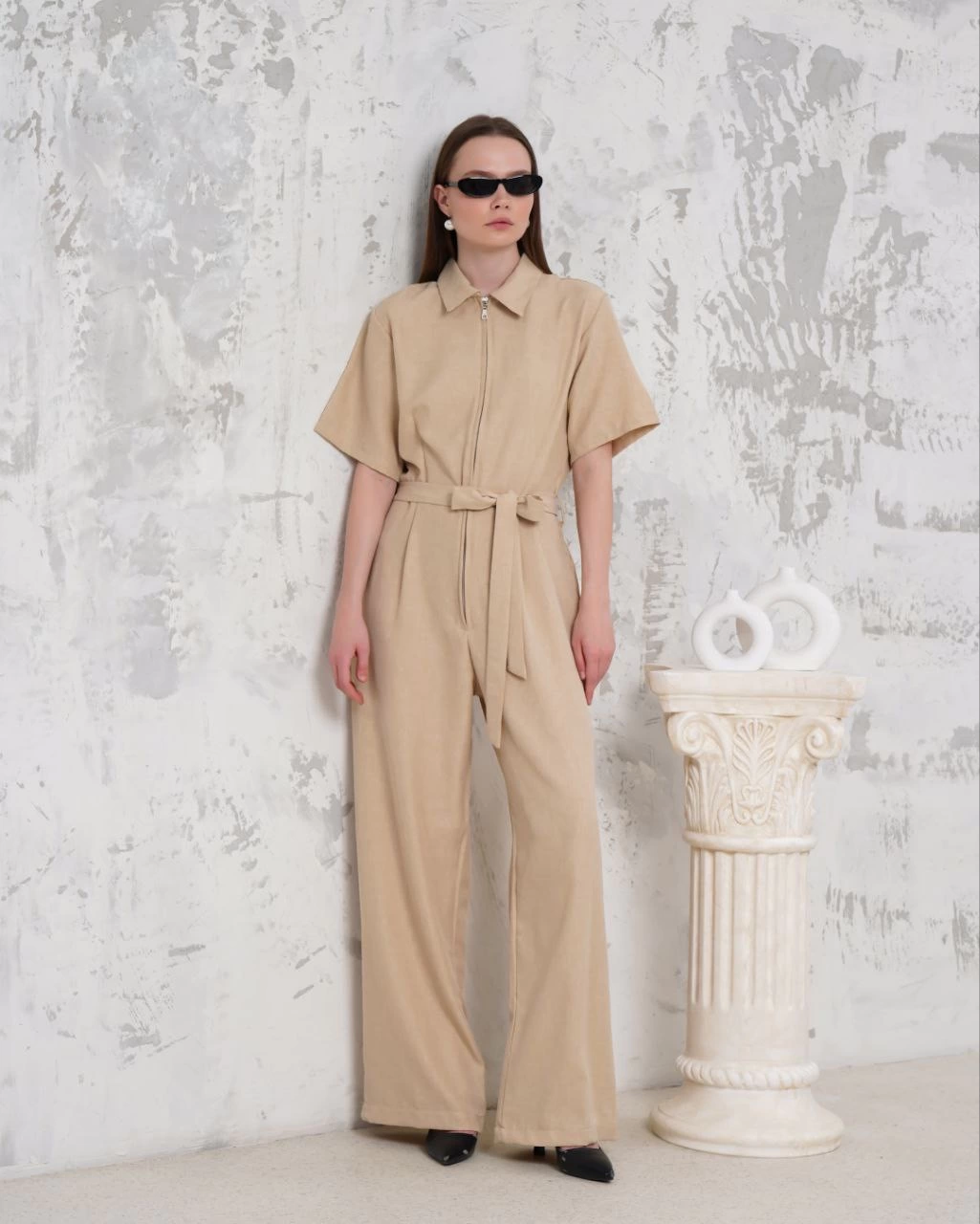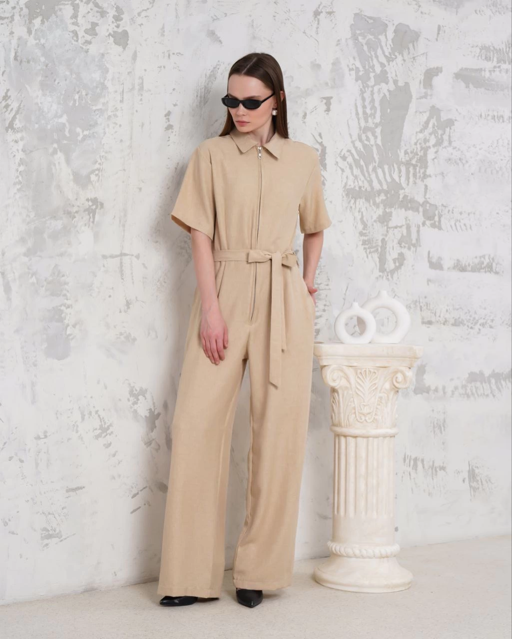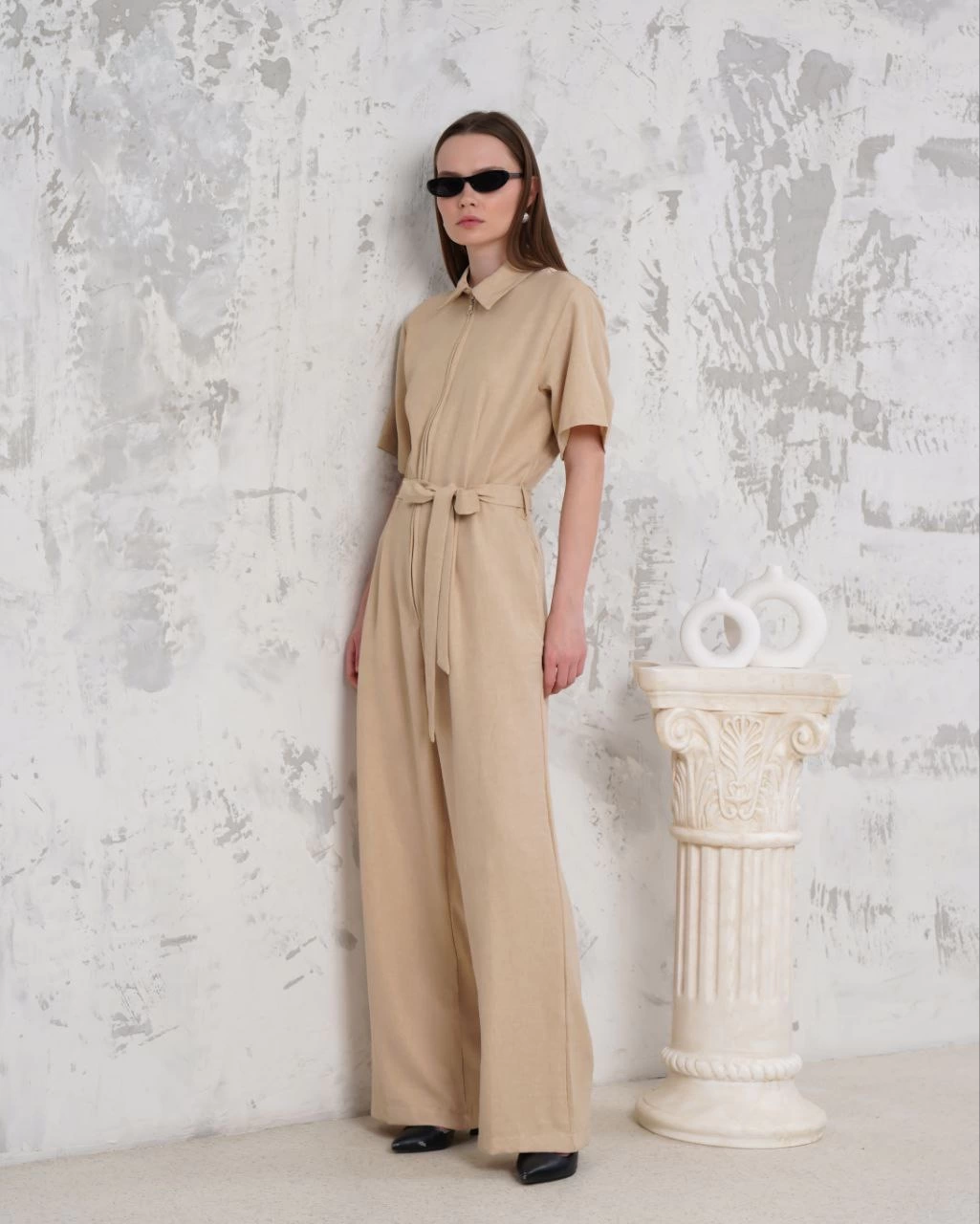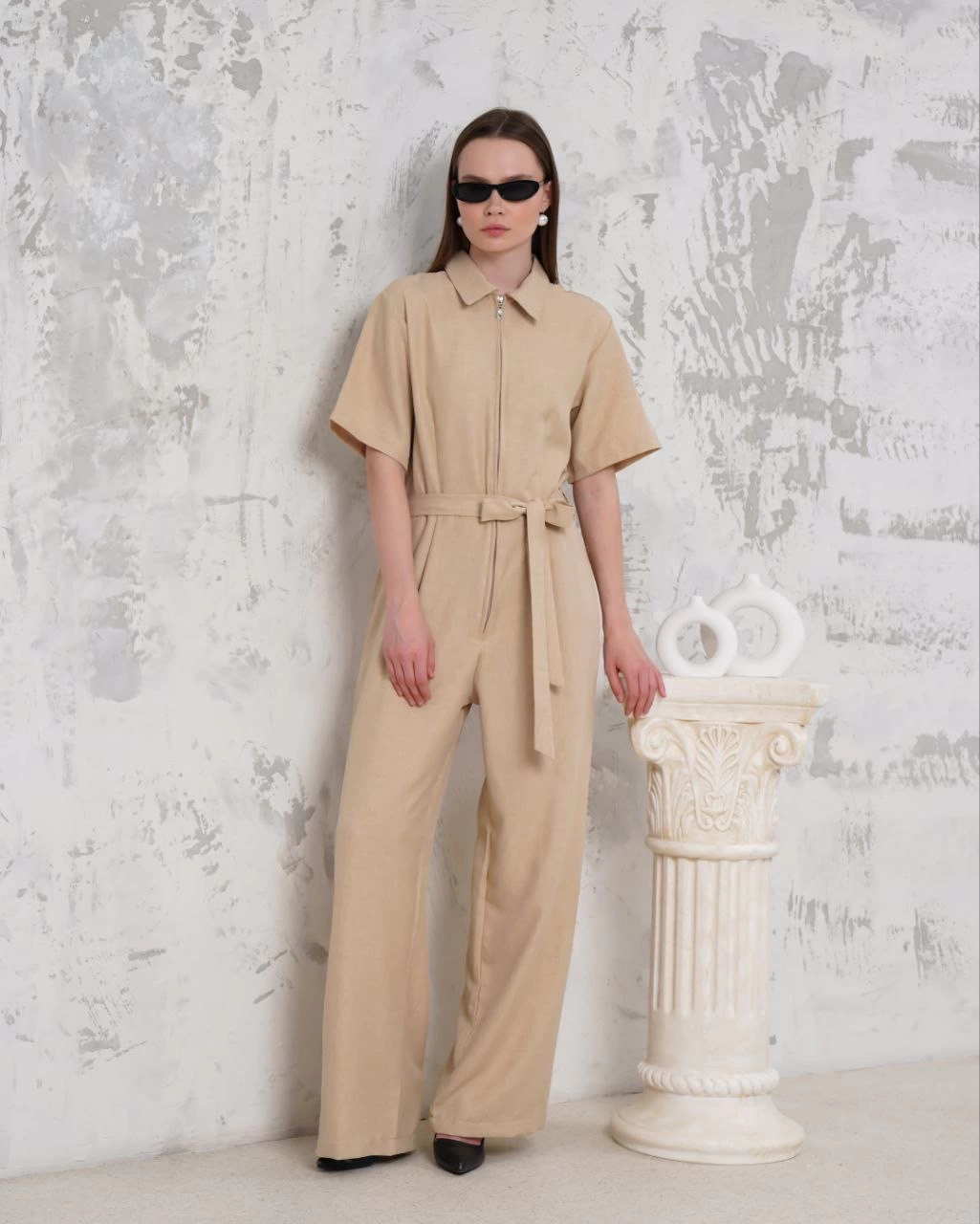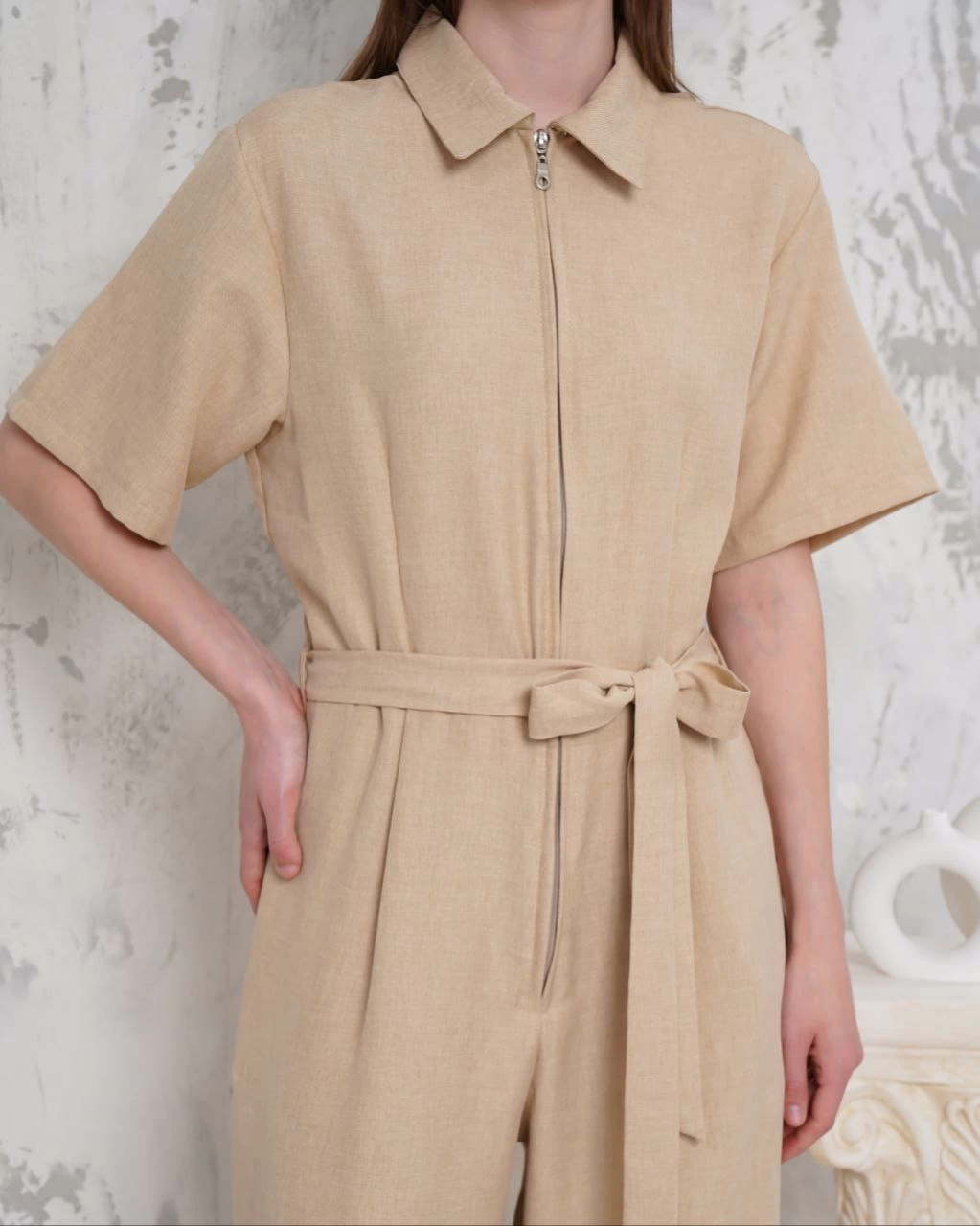 Kuşaklı gömlek yaka salaş tulum bej s255822 (Beden: S)