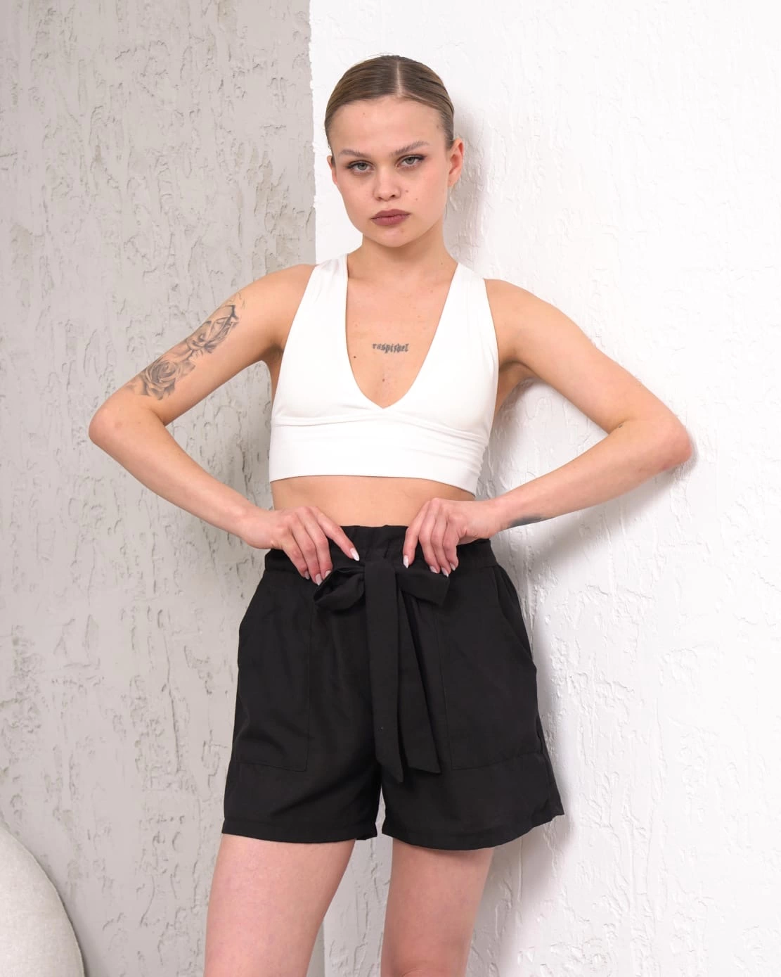 Bu sezonun trend parçalarından biri olan kuşaklı keten şort siyah s255265, şıklığı ve rahatlığı bir arada sunuyor.