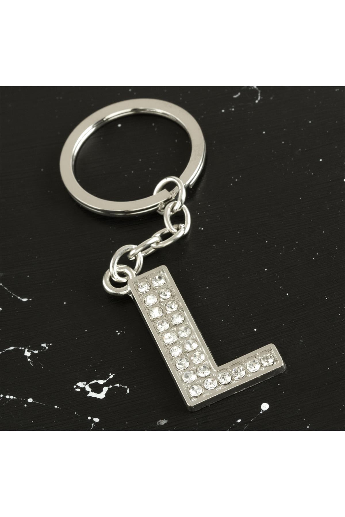 L Harfli Taşlı Anahtarlık-Gümüş Rengi