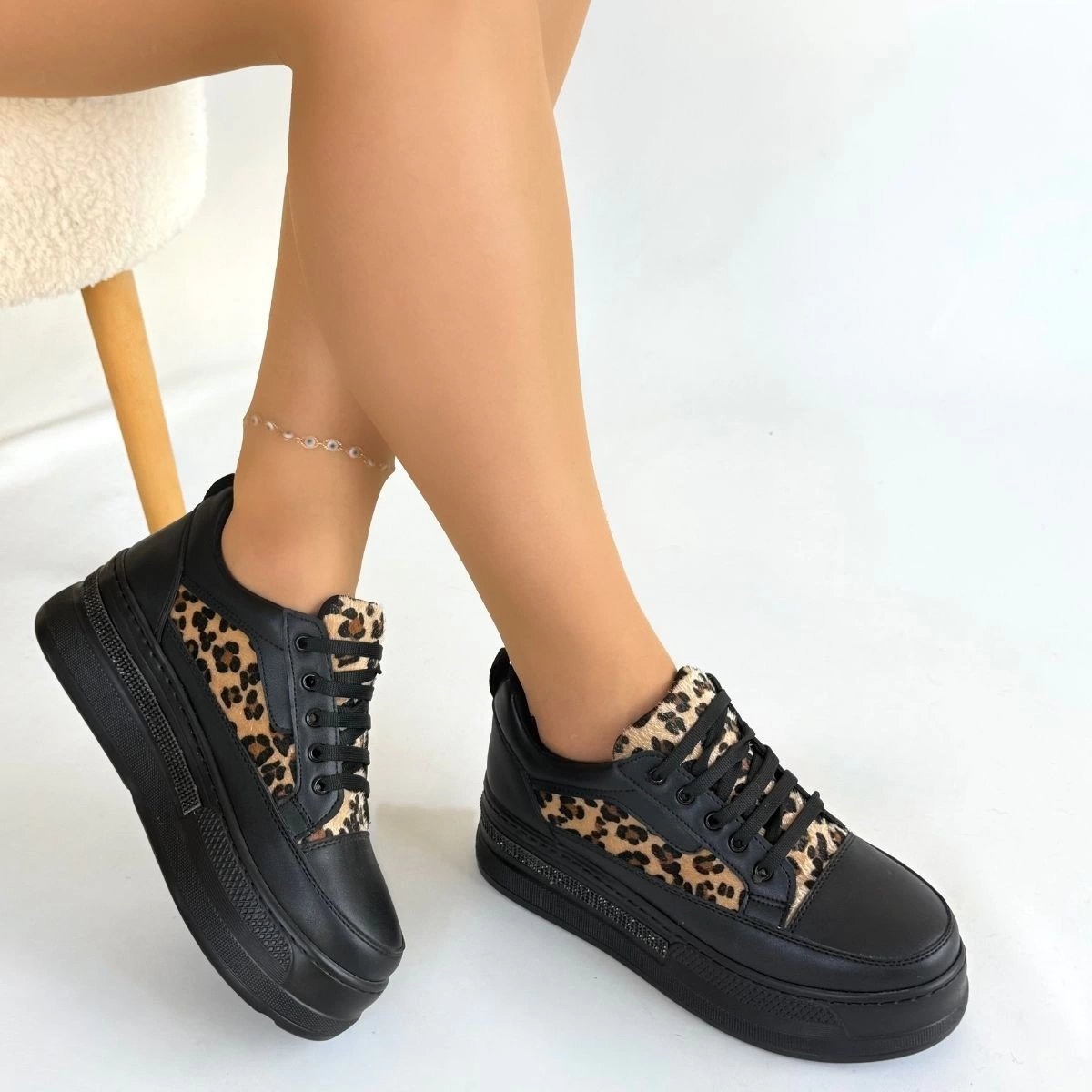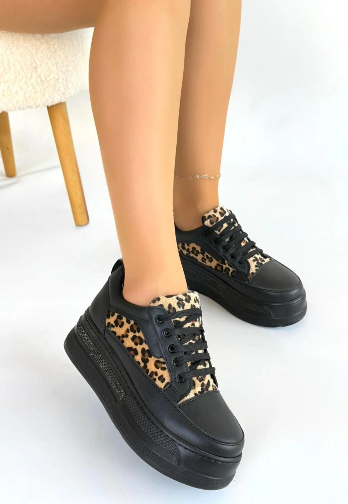 Lorrin Siyah Cilt Leopar Detaylı Bağcıklı Spor Ayakkabı (Numara: 37)