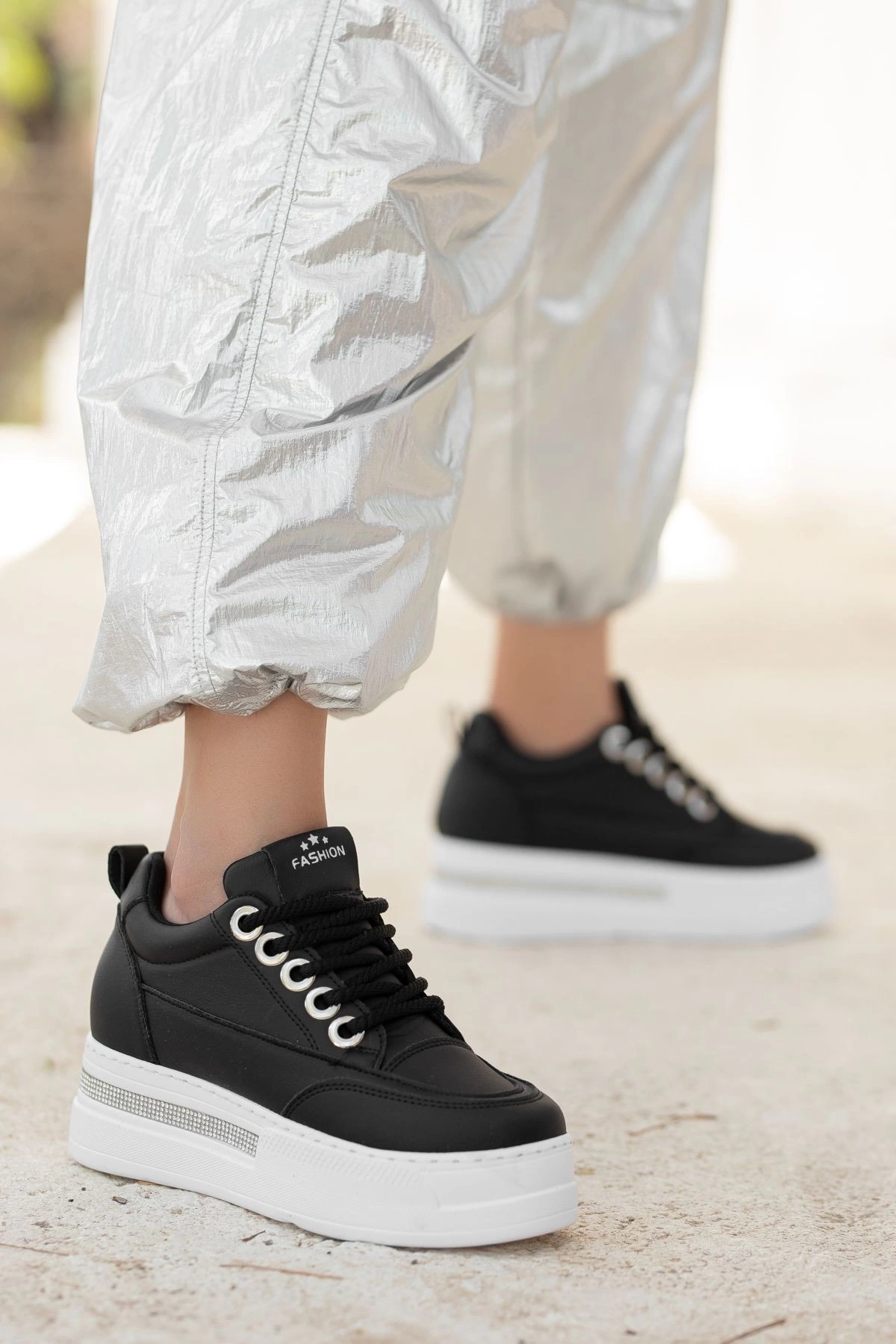 Lulu Siyah Cilt Beyaz Tabanlı Bağcıklı Spor Ayakkabı (Numara: 40)