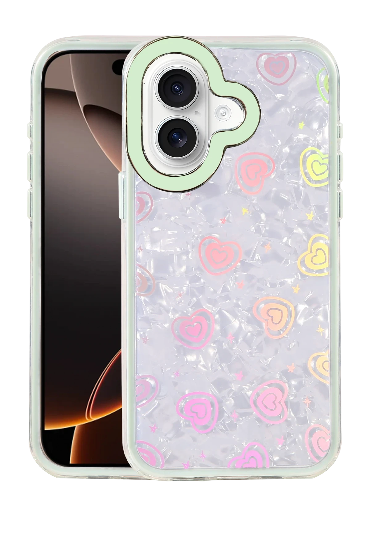 ✅ Kristal şeffaf tasarımı ve renkli kalp desenleriyle şık bir görünüm sunar.