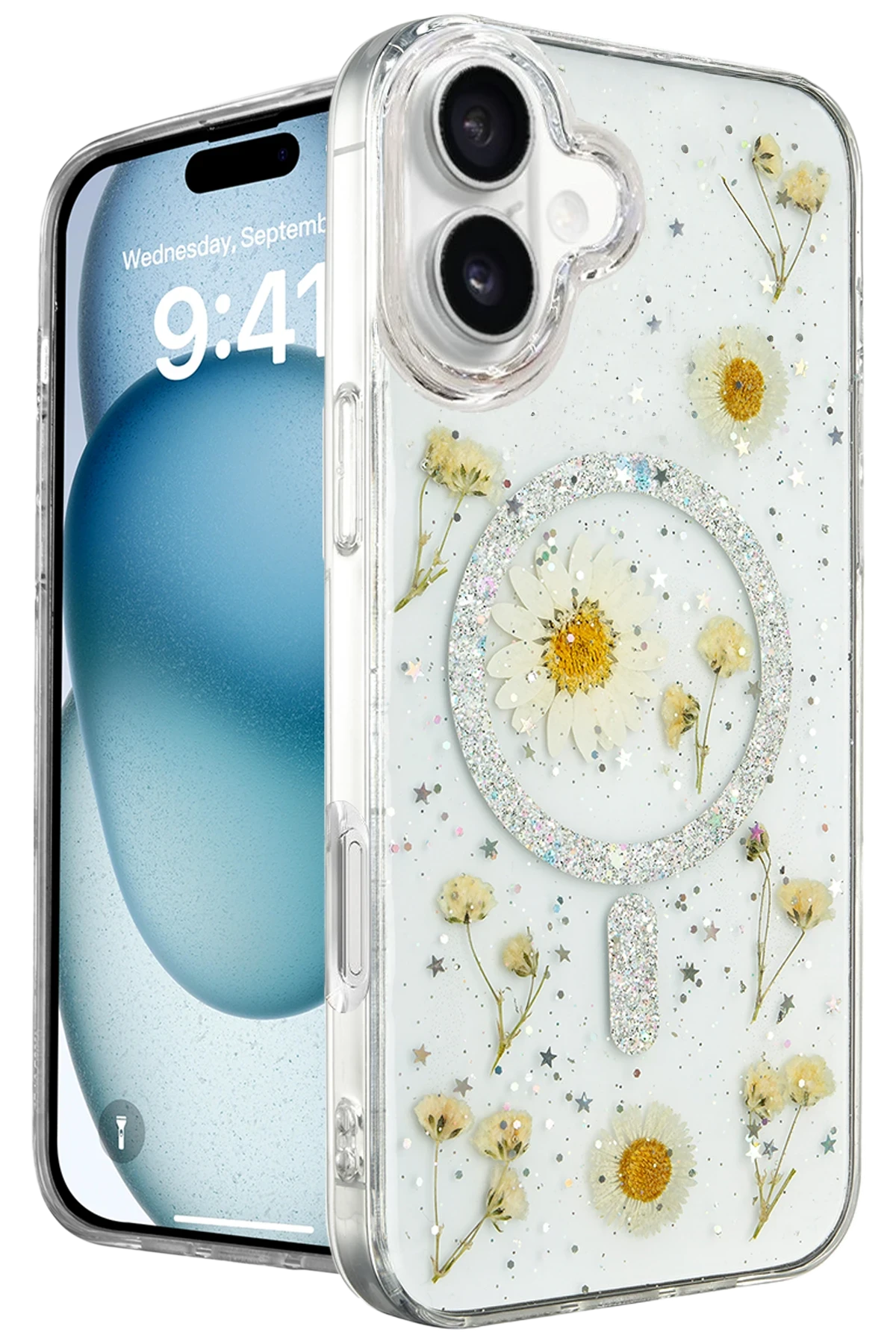 Daisy Simli MagSafe Kapak, doğanın zarafetini ve sadeliğini yansıtan, içinde gerçek çiçeklerin bulunduğu eşsiz bir tasarıma sahiptir. Kapak, içindeki gerçek papatya çiçekleri ve simli arka planı ile cihazınıza doğal bir güzellik katarken, her kapak kendi içinde benzersizdir. Bu, telefonunuzu hem korurken hem de ona kişisel bir dokunuş ekler.