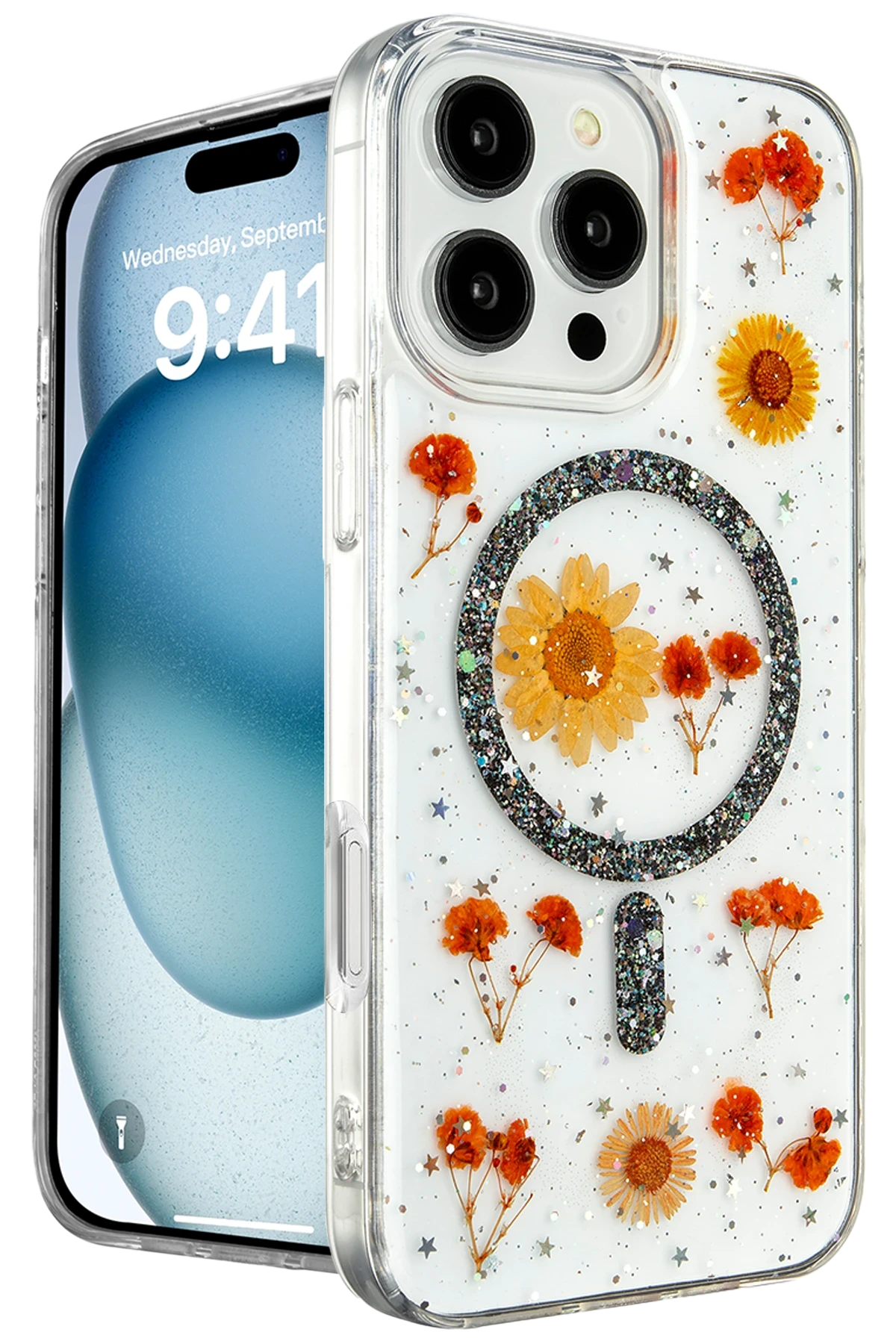 Daisy Simli MagSafe Kapak, doğanın zarafetini ve sadeliğini yansıtan, içinde gerçek çiçeklerin bulunduğu eşsiz bir tasarıma sahiptir. Kapak, içindeki gerçek papatya çiçekleri ve simli arka planı ile cihazınıza doğal bir güzellik katarken, her kapak kendi içinde benzersizdir. Bu, telefonunuzu hem korurken hem de ona kişisel bir dokunuş ekler.