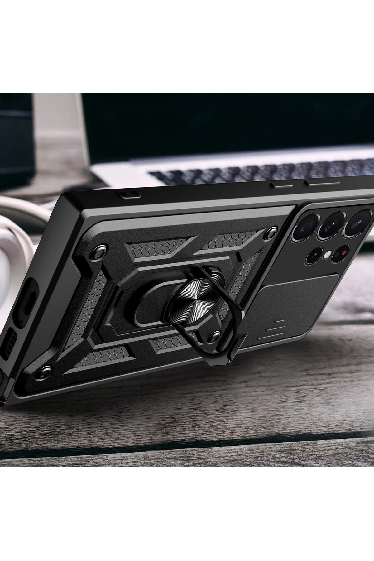 Kılıfın arka kısmında yer alan entegre metal halka hem tutucu hem de stand olarak işlev görür. Eller serbest video izleme, içerik görüntüleme ya da masaüstü kullanımı için idealdir.