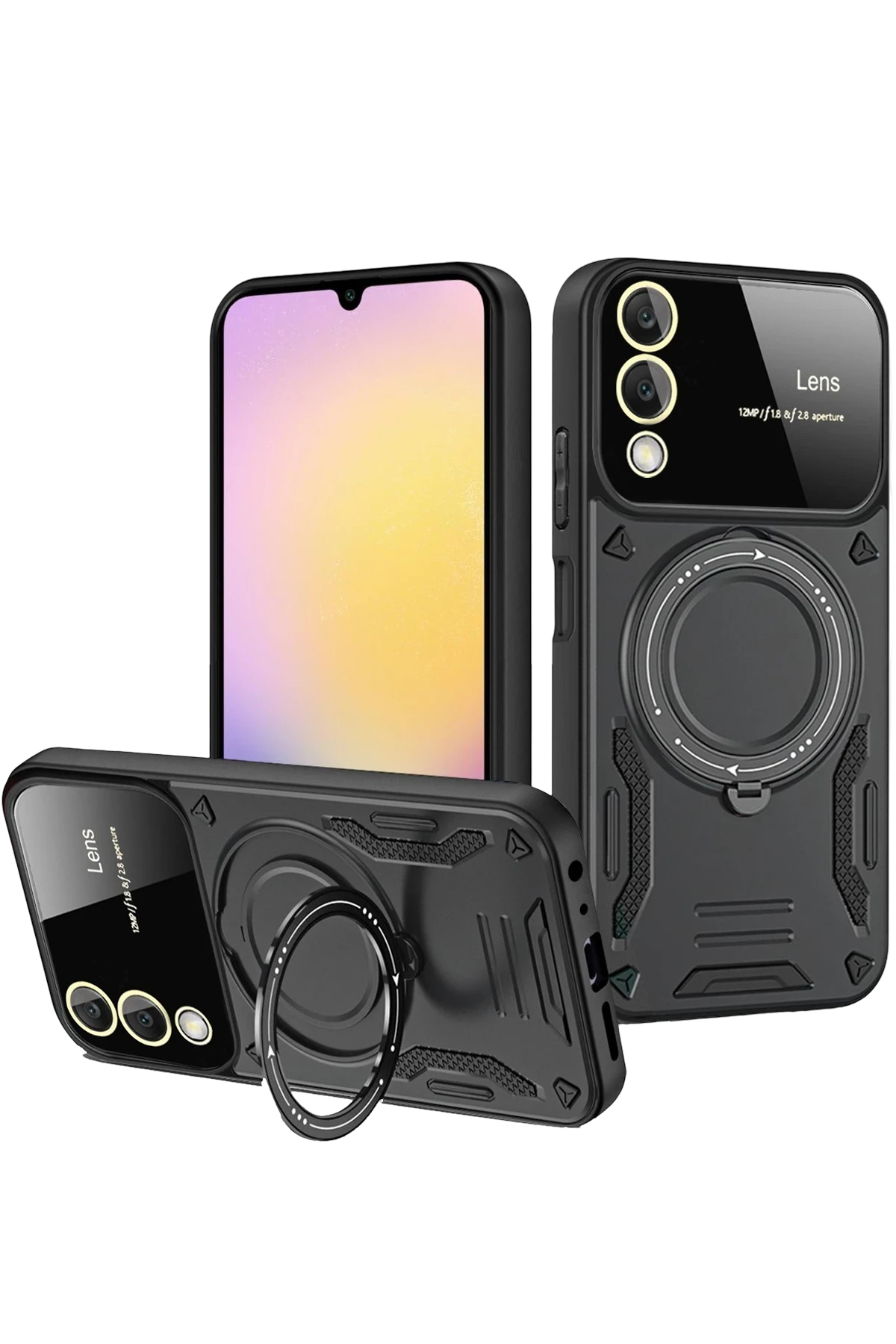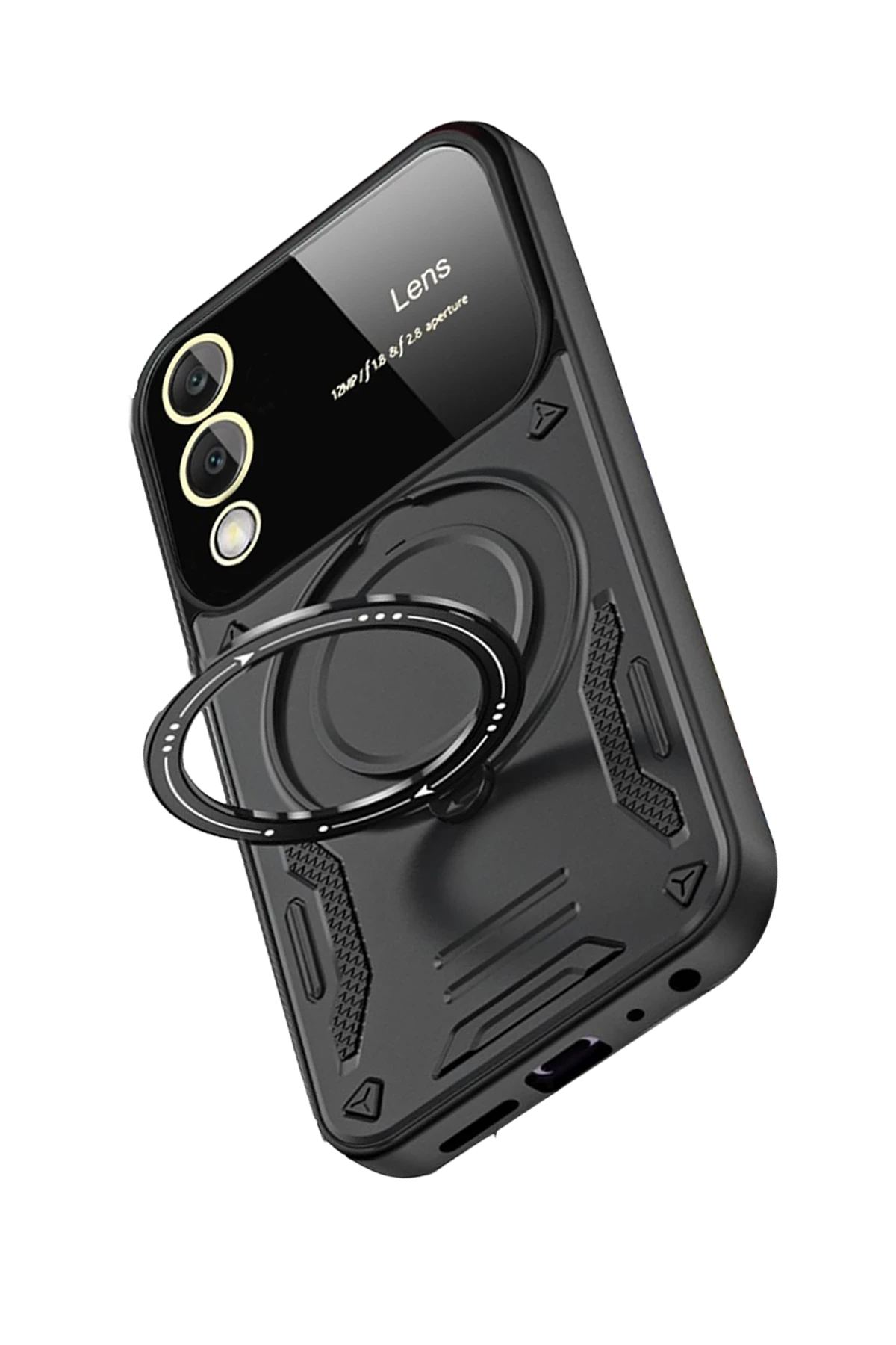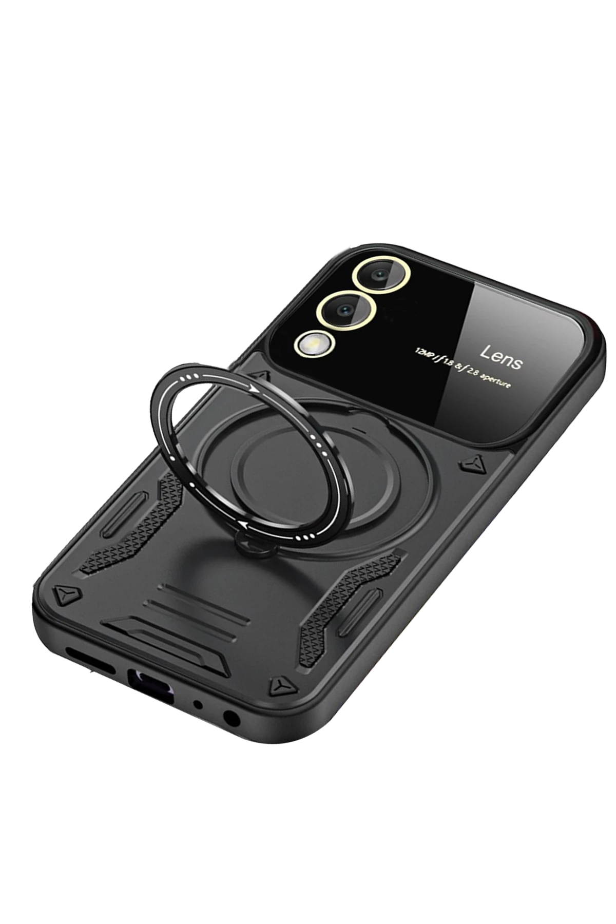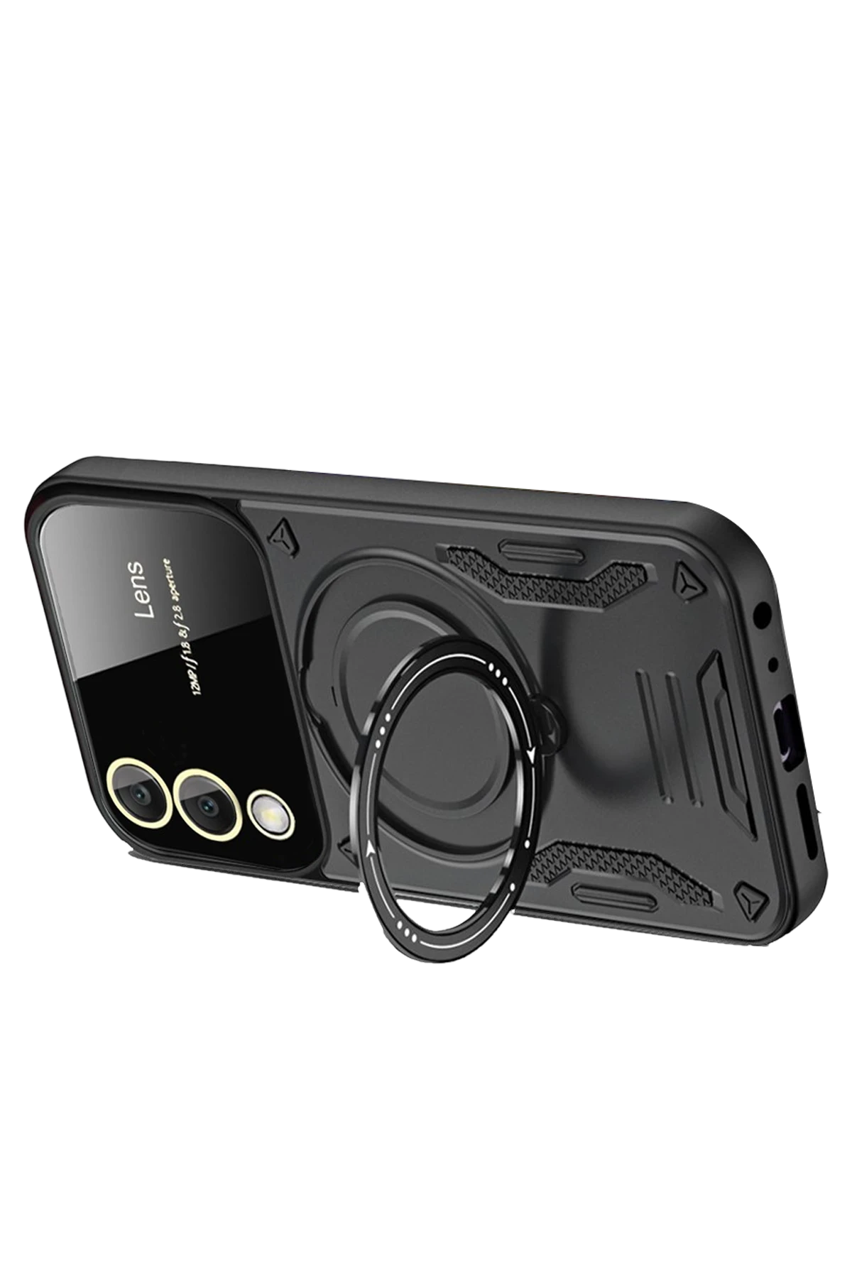 Arka yüzeyde yer alan koruyucu lens çerçevesi, kamera camının çizilmesini ve kırılmasını önler. Entegre metal halka, hem parmak tutucu hem de stand işlevi görerek video izleme ve görüşmelerde kullanım kolaylığı sağlar.