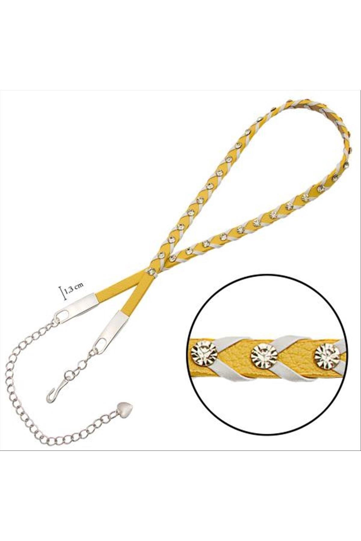 Örgülü Deri Taşlı Kemer-Sarı