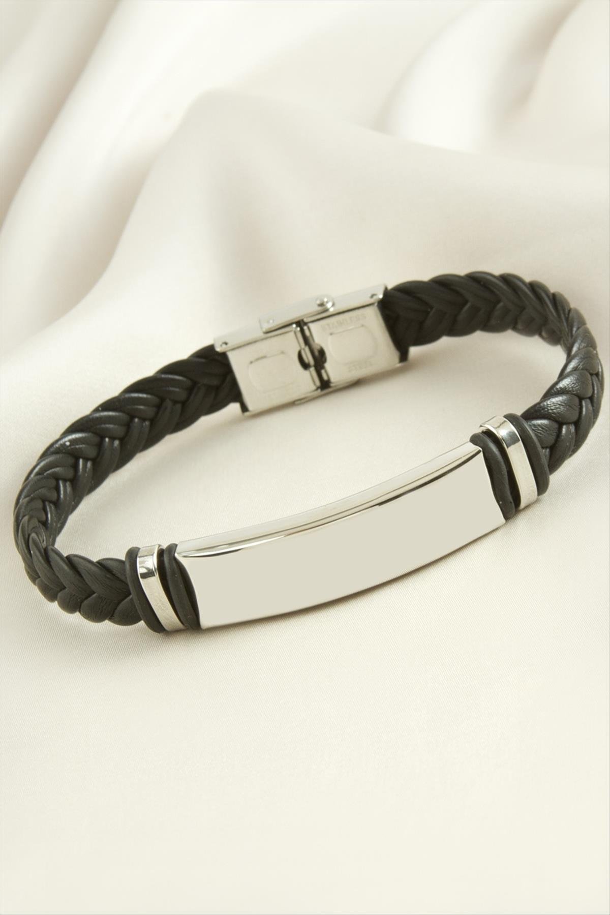 Örgülü İsim Yazılabilir Deri Çelik Bileklik-Siyah