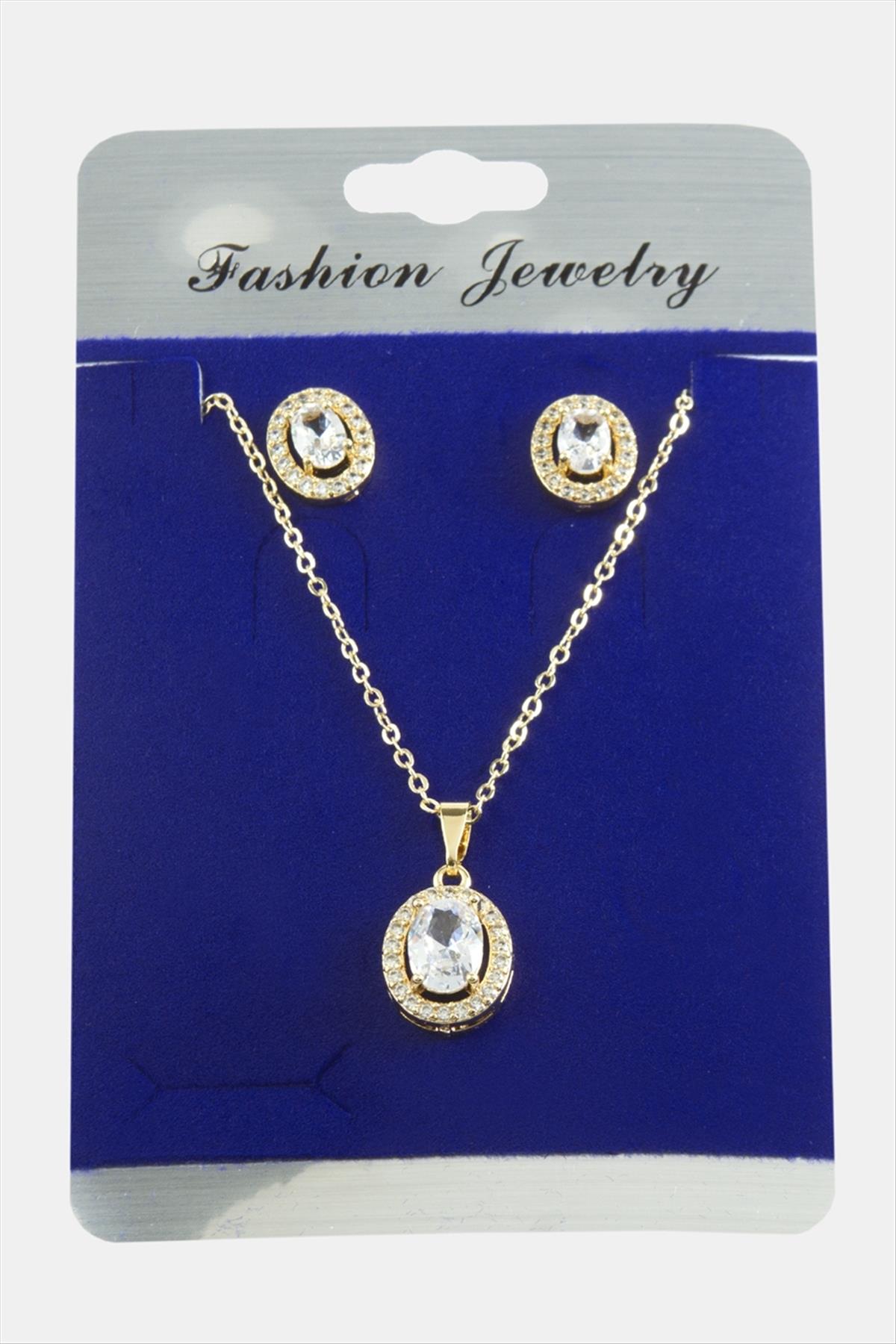 Oval Zirkon Taşlı Set Kolye-Gümüş Rengi