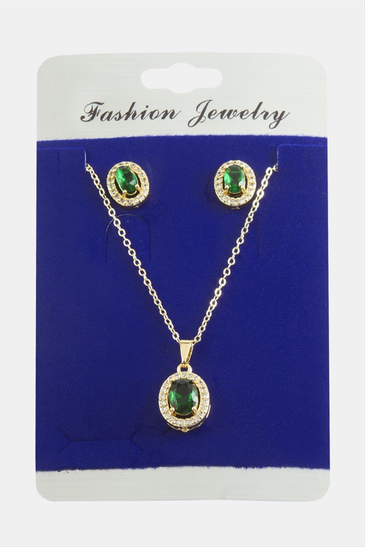 Oval Zirkon Taşlı Set Kolye-Yeşil