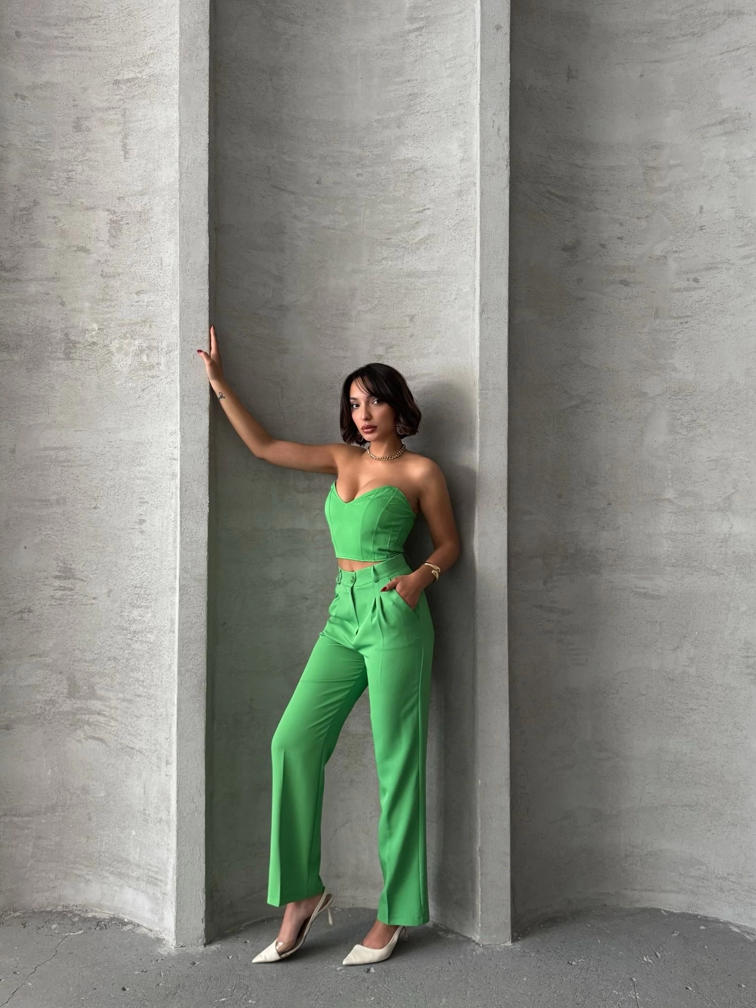 Yumuşak dokulu kumaşı ile gün boyu konfor sunan yeşil takım, salaş ve şık bir görünüm sunuyor.