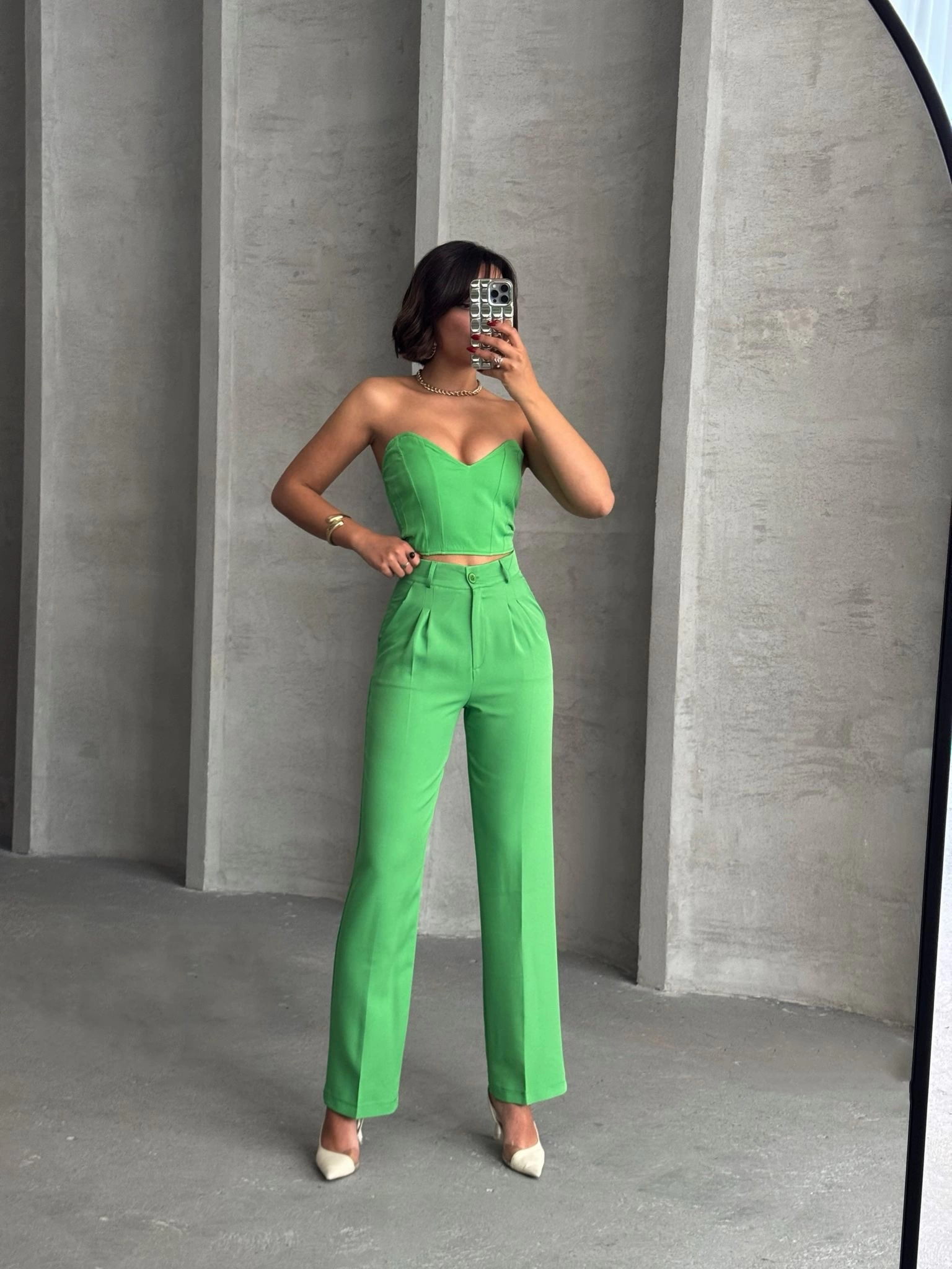 İster günlük şıklıkta isterseniz özel bir davette tercih edebileceğiniz bu takım, iddialı görünümüyle dikkat çekiyor.