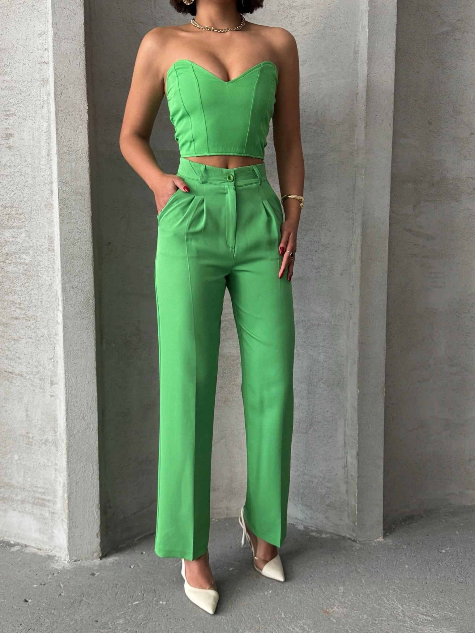 Palazzo pantolonlu alt üst takım yeşil (Beden: L)
