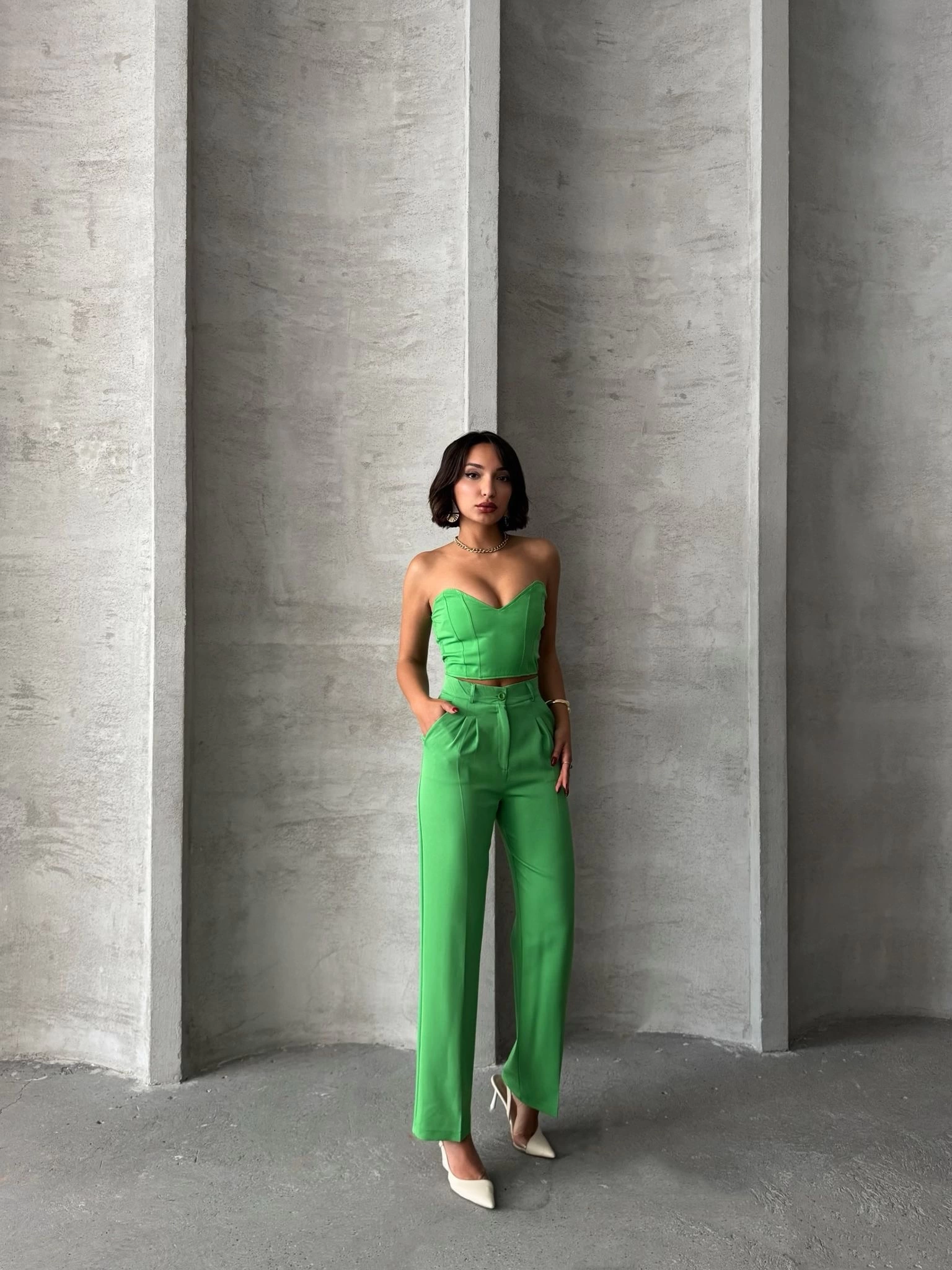 Yeşil Palazzo Pantolonlu Alt Üst Takım, şıklık ve rahatlığı bir arada sunuyor.