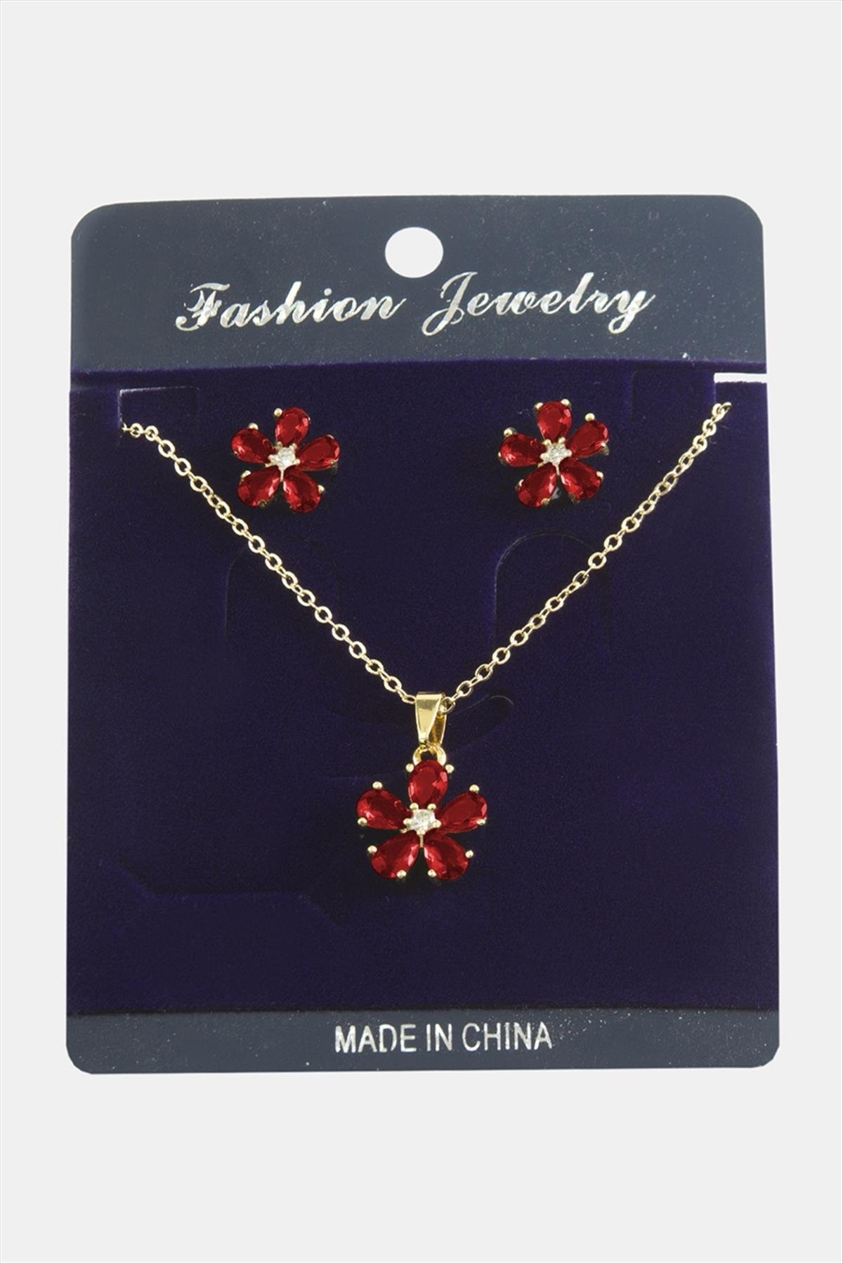 Papatya Zirkon Taşlı Set Kolye-Kırmızı