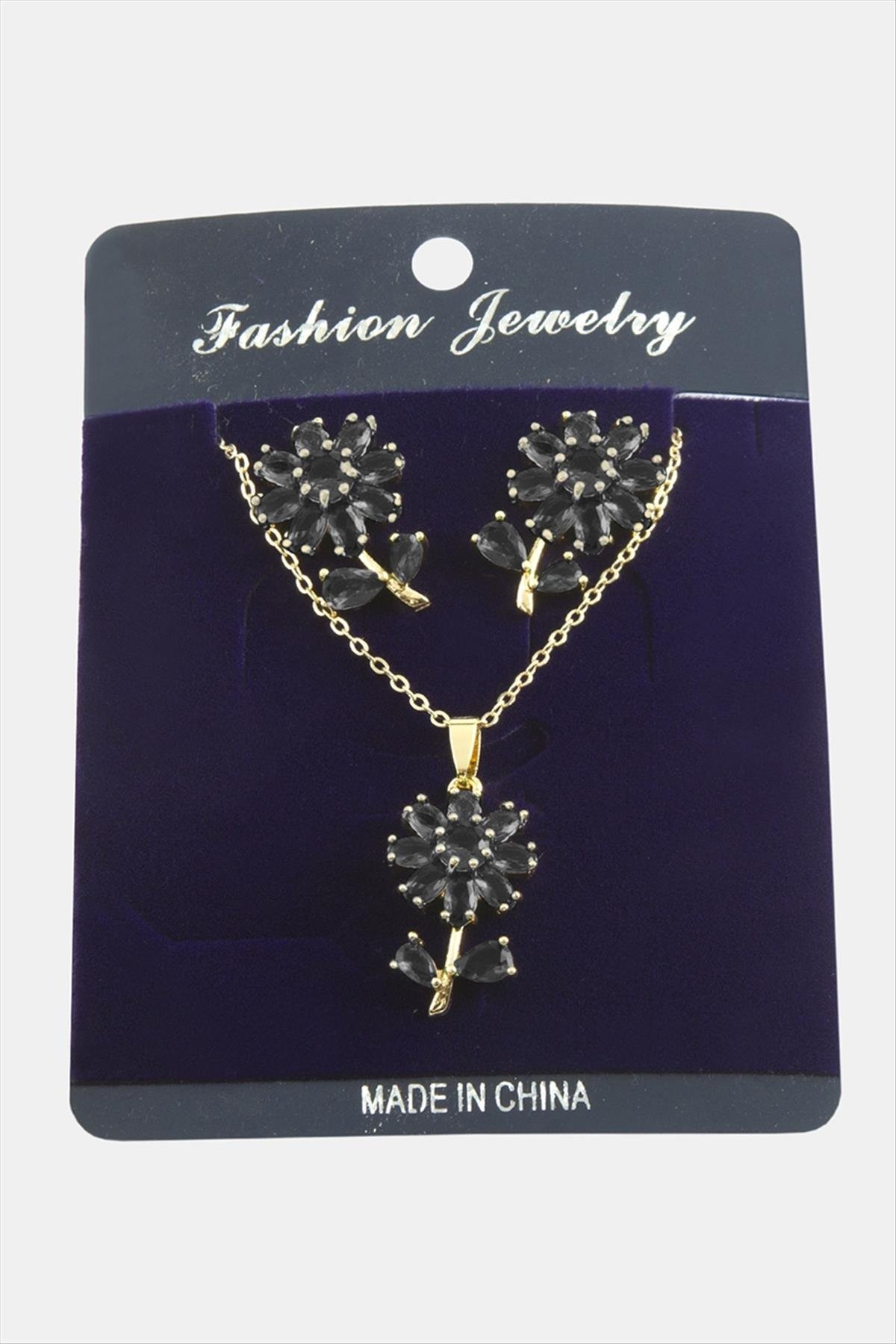 Papatya Zirkon Taşlı Set Kolye-Siyah