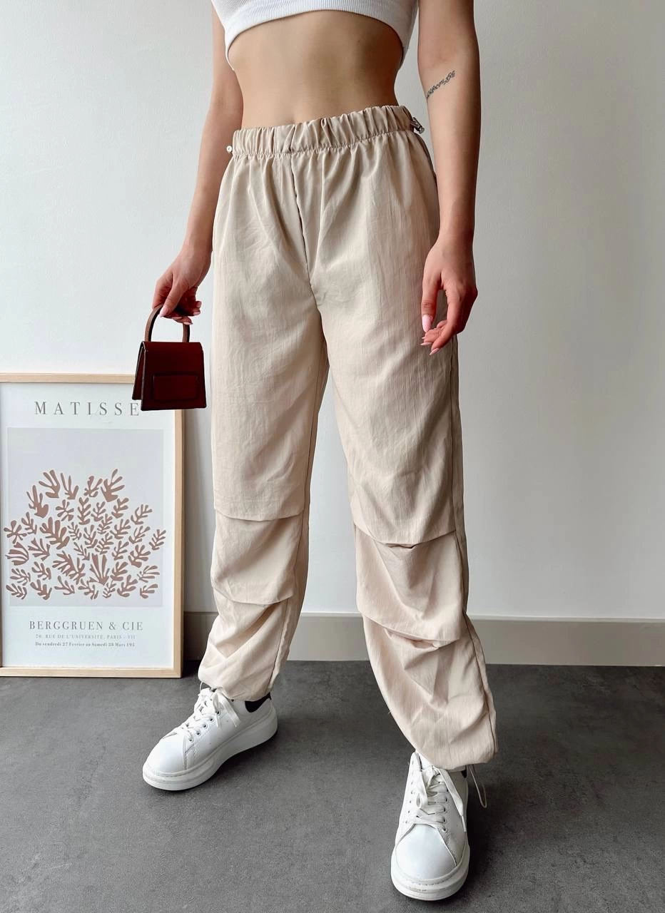 Şık ve rahatlık arayan kadınlar için ideal bir seçenek olan Bej Paraşüt Pantolon, gardırobunuzun vazgeçilmez parçalarından biri olmaya aday!