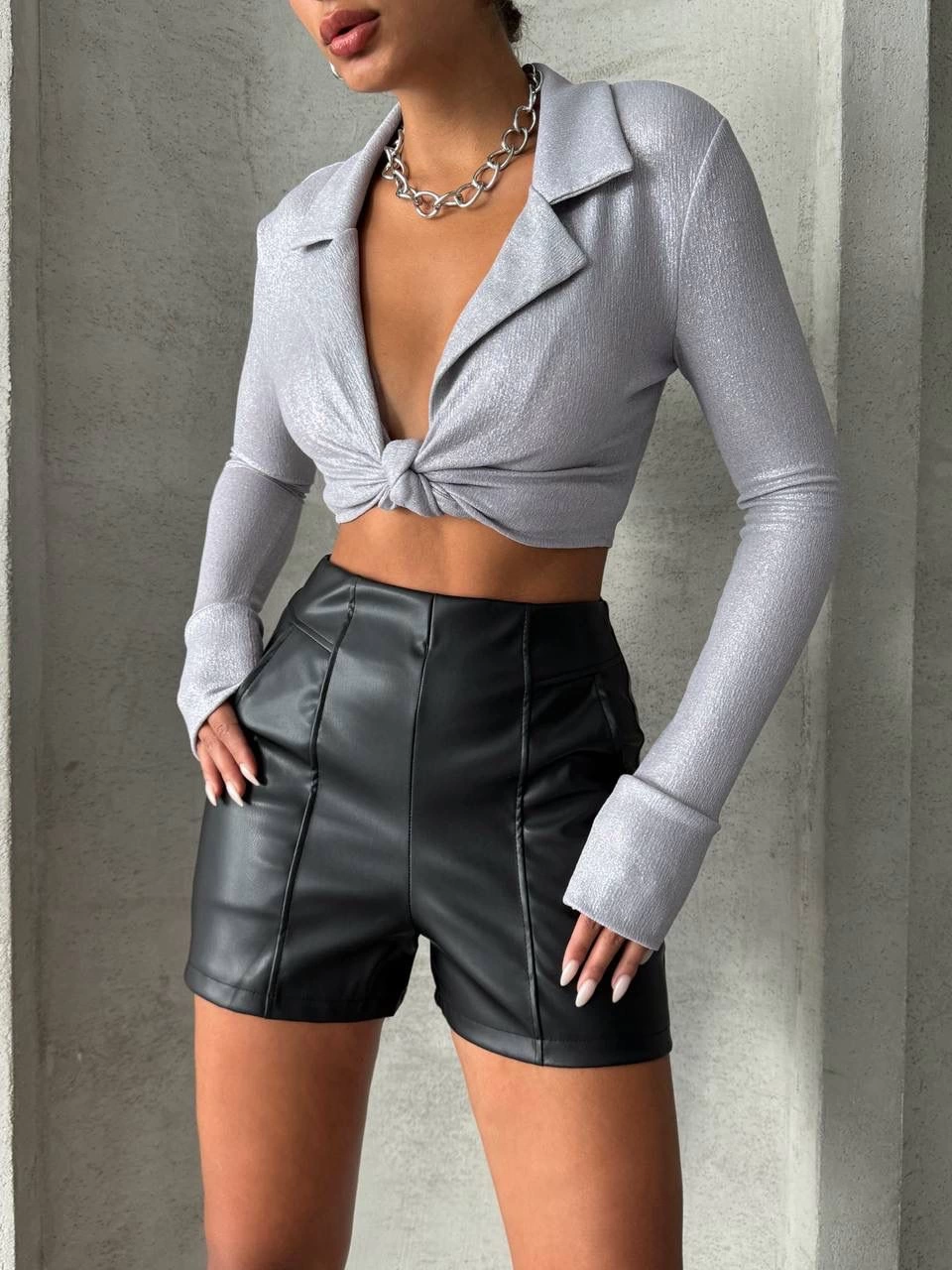 Bu şık ve şıklık arayan kadınlar için ideal olan siyah deri şort, gardırobunuzun vazgeçilmezi olmaya aday. Parçalı cepli tasarımı ile hem şık hem de kullanışlı bir görünüm sunar.