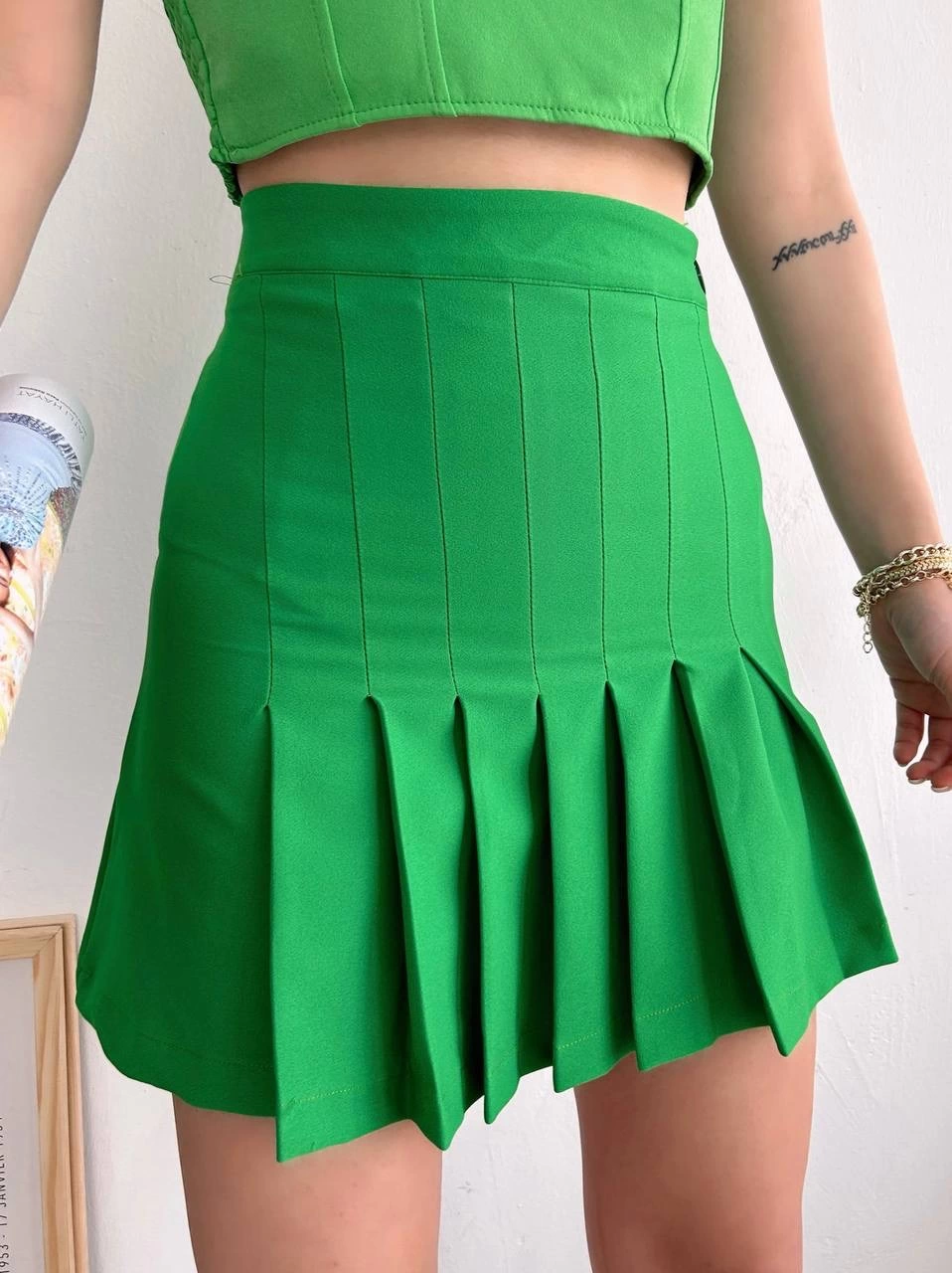 Açık yeşil rengi ile doğanın tazeliğini yansıtan bu etek, her mevsim kolaylıkla kombinlenebilir özelliğiyle dikkat çekiyor.