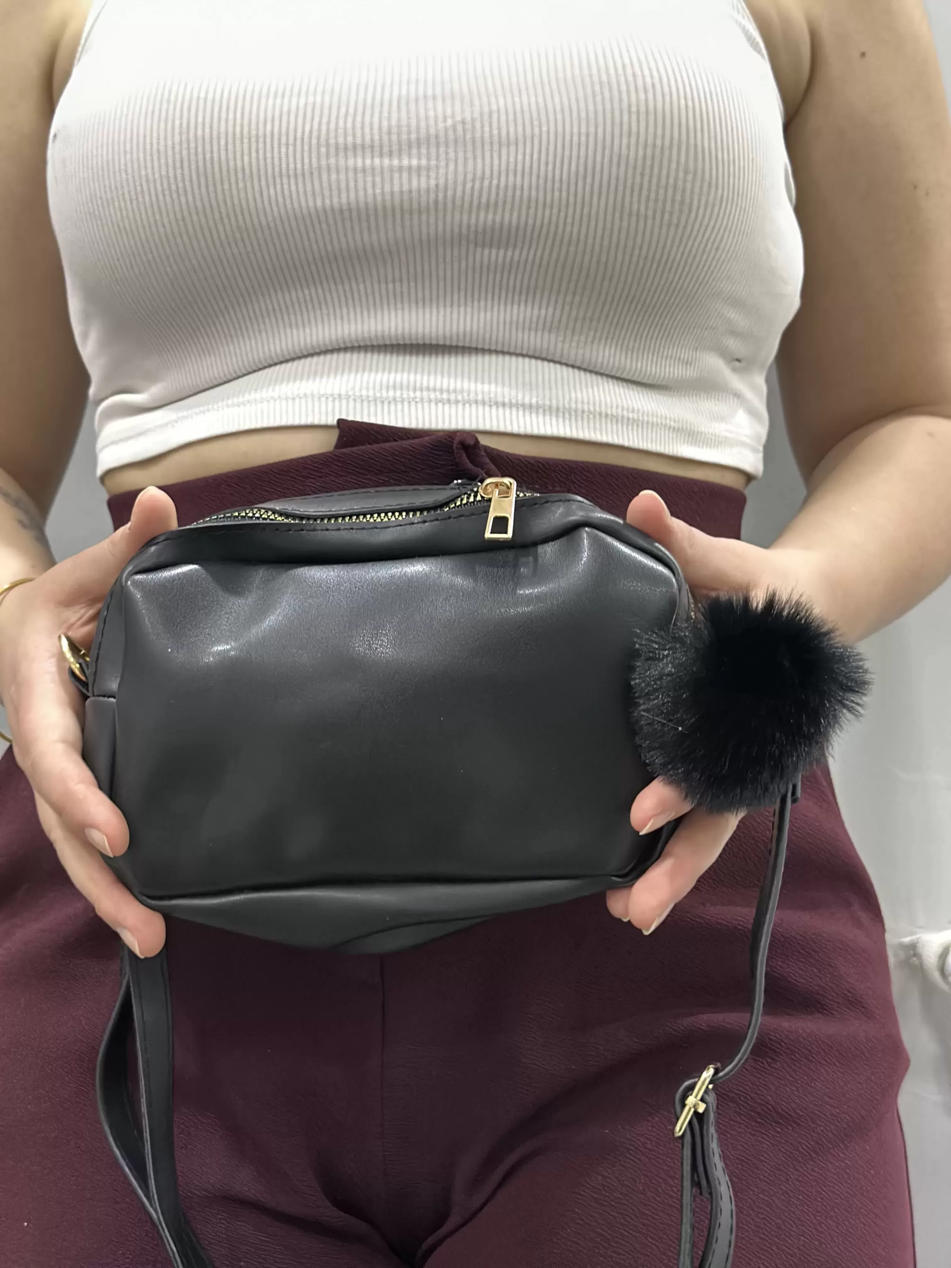 Ponpon siyah cilt çanta (Beden: STANDART)