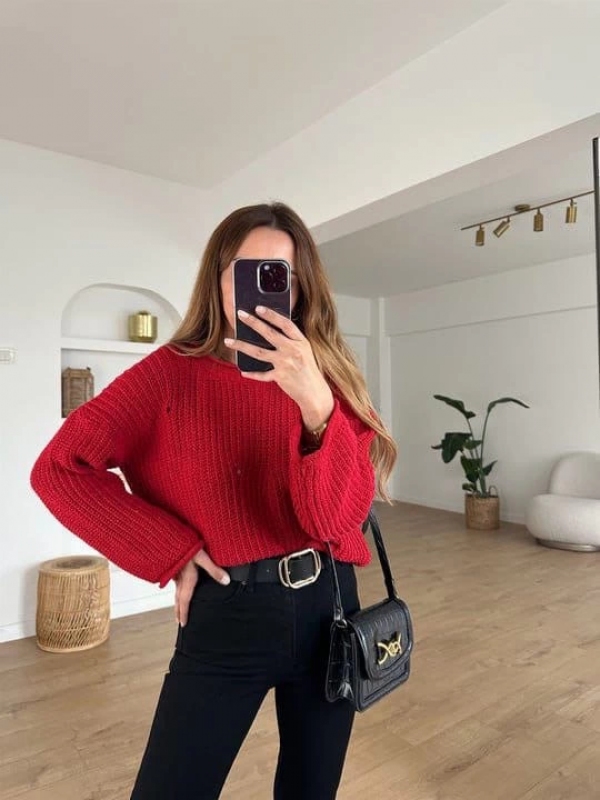 Salaş delik detaylı kazak kırmızı (Beden: STANDART)