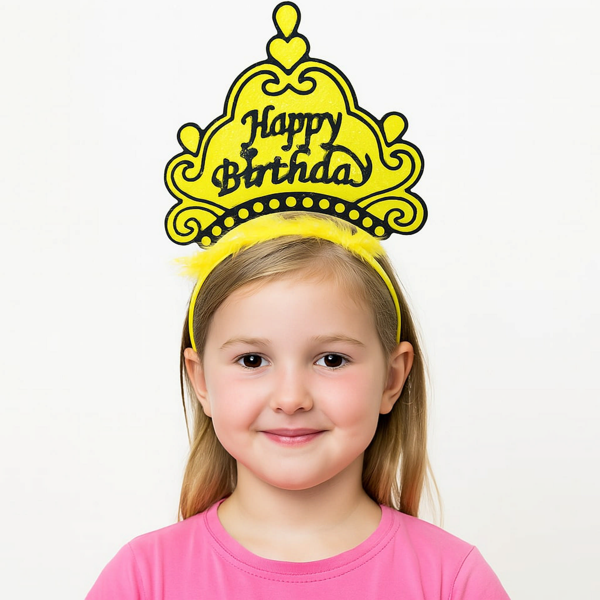 Canlı sarı rengiyle dikkat çeken "Happy Birthday" yazılı prenses tacı, kız çocuklarının doğum günü partilerinde göz kamaştırmasını sağlar. Işıltılı yüzeyi ve tüy detaylarıyla özel günlerde eğlenceli bir atmosfer yaratır. Esnek ve hafif yapısıyla tüm gün rahat kullanım sunar.