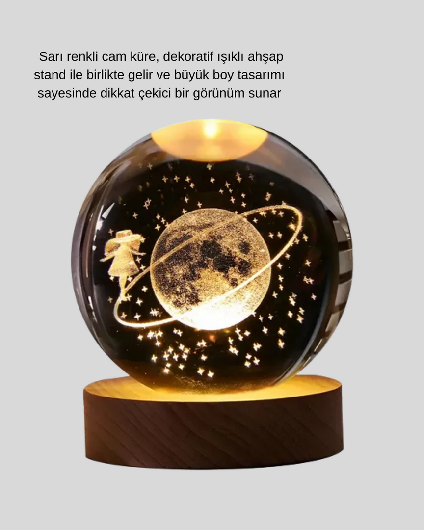 Sarı ışıklı dekoratif cam küre, büyük boy tasarımı sayesinde bulunduğu ortama anında dikkat çeken bir şıklık kazandırır. Kürenin üzerinde yer alan kız figürü, modern dekorasyon anlayışına neşeli ve sıcak bir enerji katar. Işıklı yapısı sayesinde hem gündüz hem gece etkileyici bir ambiyans oluşturur. Ahşap standı ile birlikte gelen bu dekoratif ürün, stabil duruşu ve kolay taşınabilir yapısı ile kullanım kolaylığı sağlar. Evinizde, ofisinizde, çalışma masanızda veya yatak odanızda estetik bir tamamlayıcı olarak kullanılabilir.